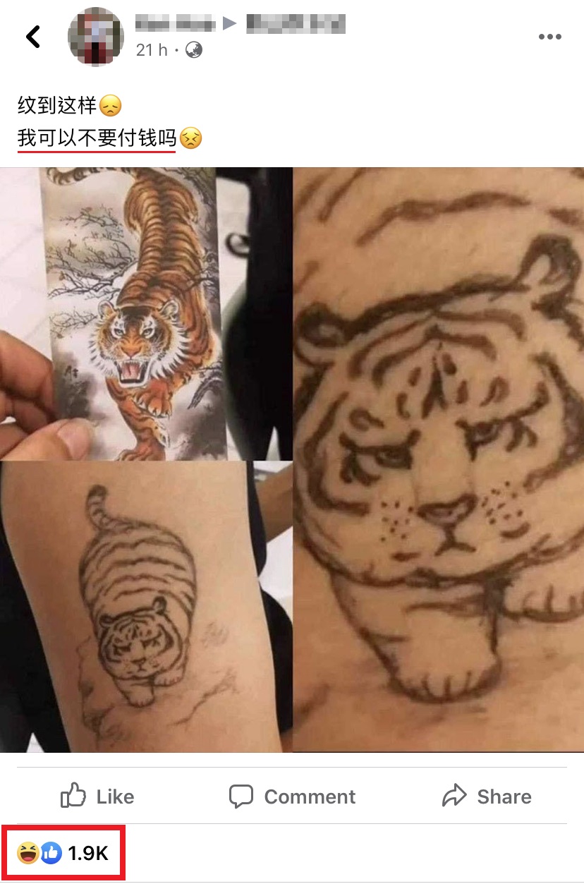 一名大马网友在面子书分享经历,原本和纹身师说好的「猛虎」,纹出来的却是一只「萌虎」!