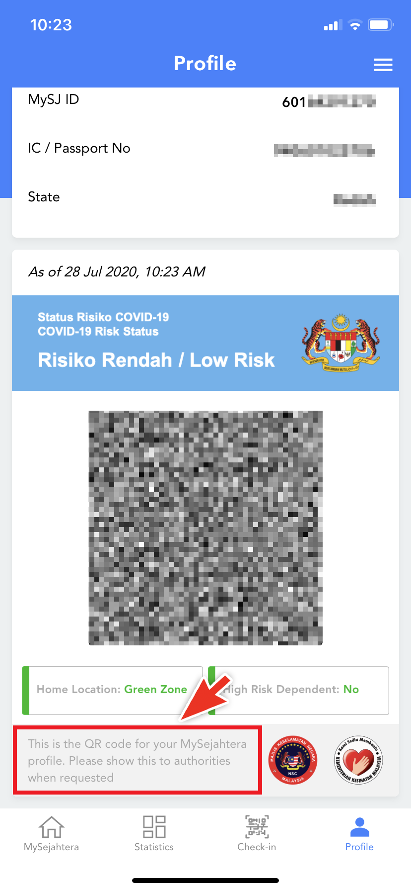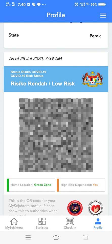 其实Mysejahtera app,你按profile,然后会出现一个QR CODE的,那个是有警察来检查时,我们开给警察扫描,就可以证明我们去过哪里,和有没有scan check in了。