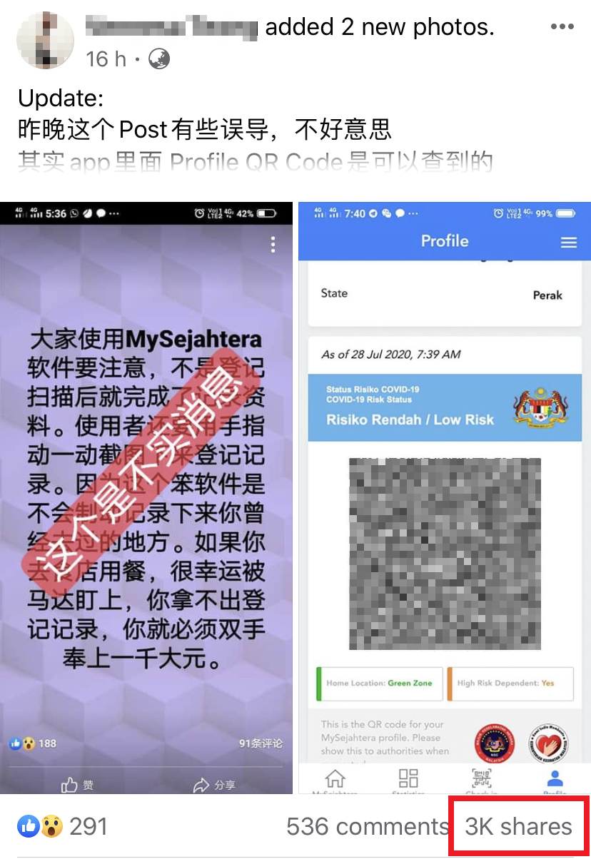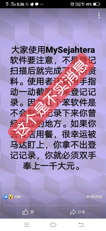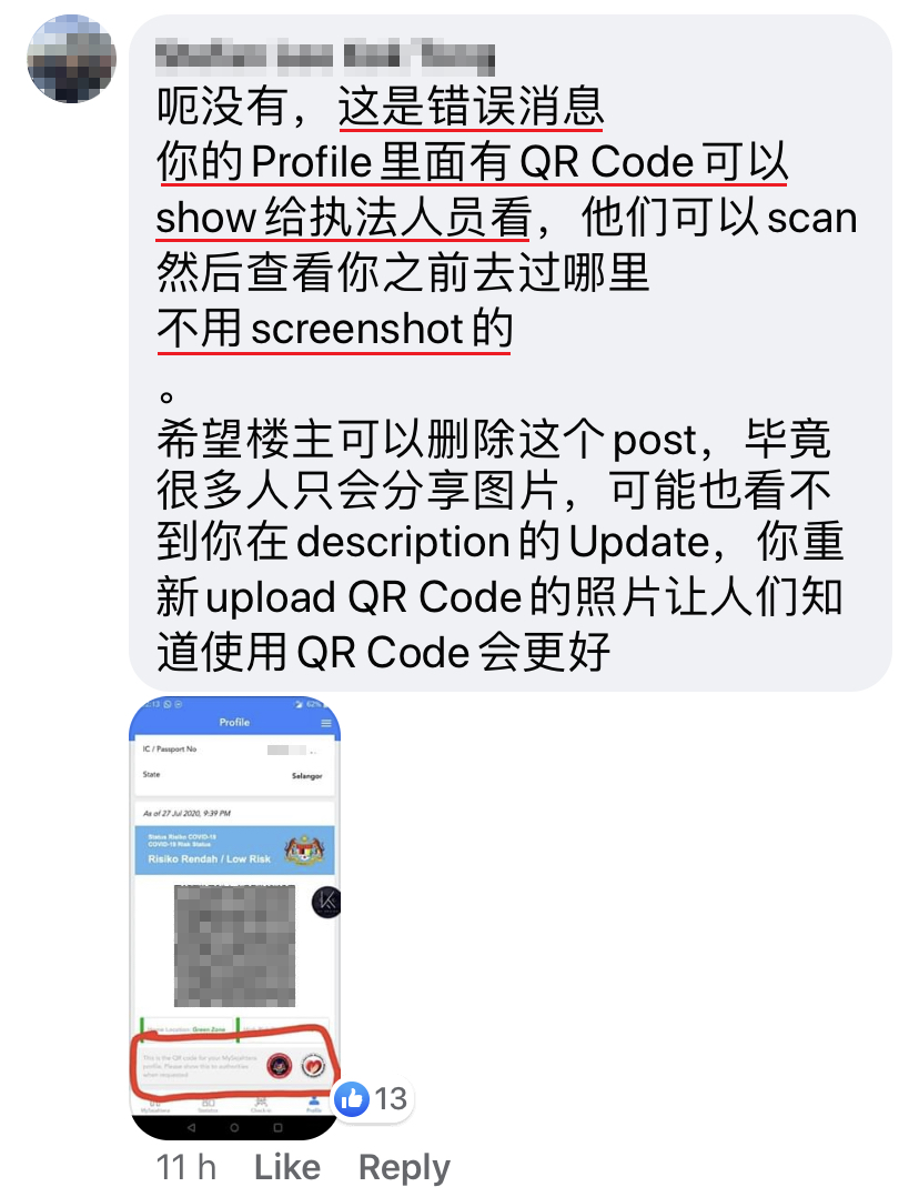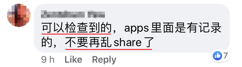 事后,网友通过面子书发文澄清这件事,并为自己转发错误信息而向大家致歉。网友在帖文里也教大家,如何使用 MySejahtera App 查询记录,并出示给警方。