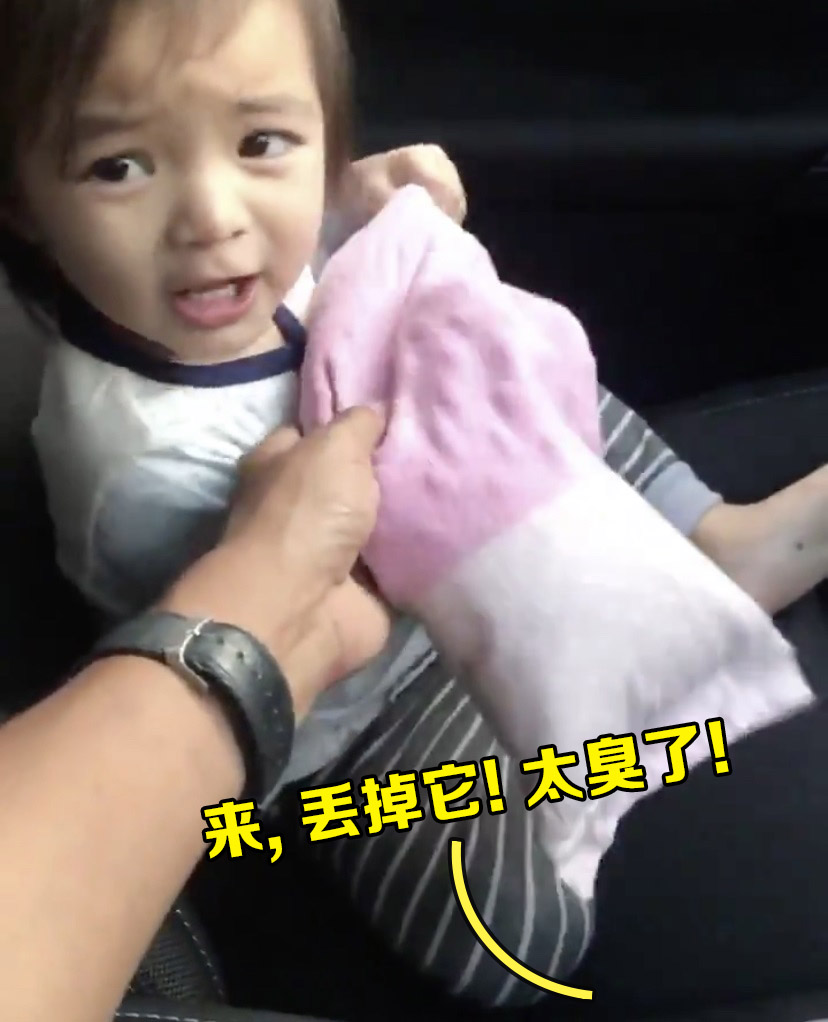 在45秒的视频一开始,拿着手机拍摄的爸爸一手拿起女儿怀中的“臭臭”,告诉她说:「丢掉这个吧!咦~ 很臭~ 」
