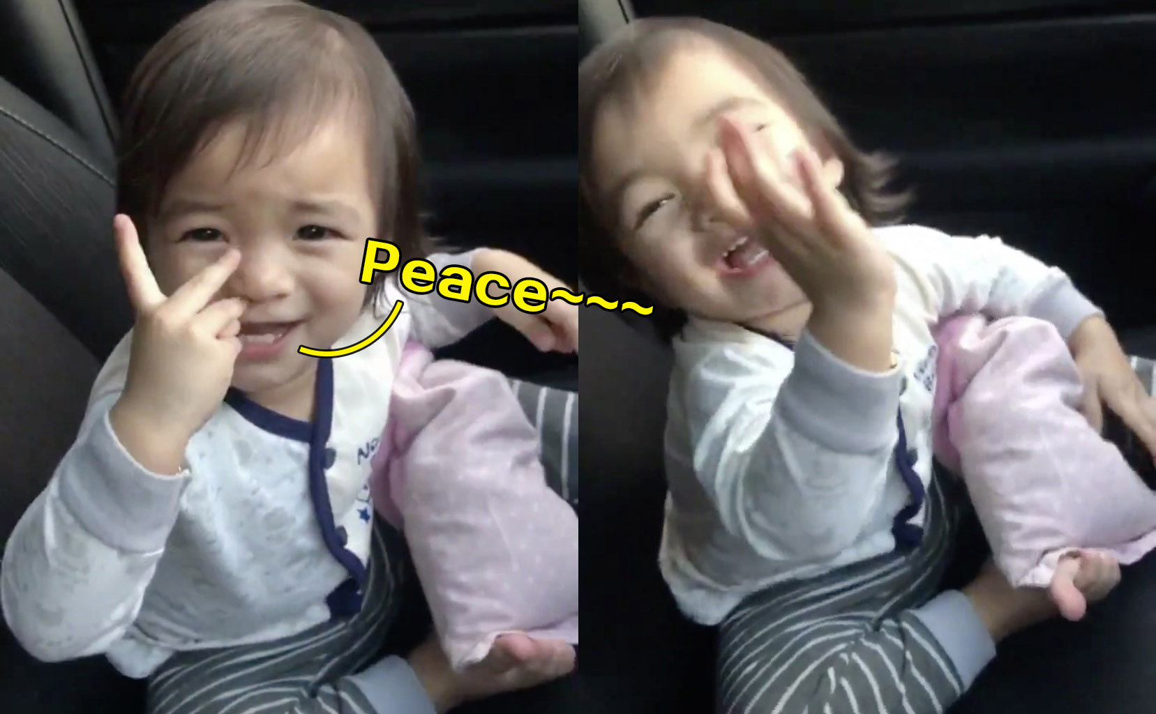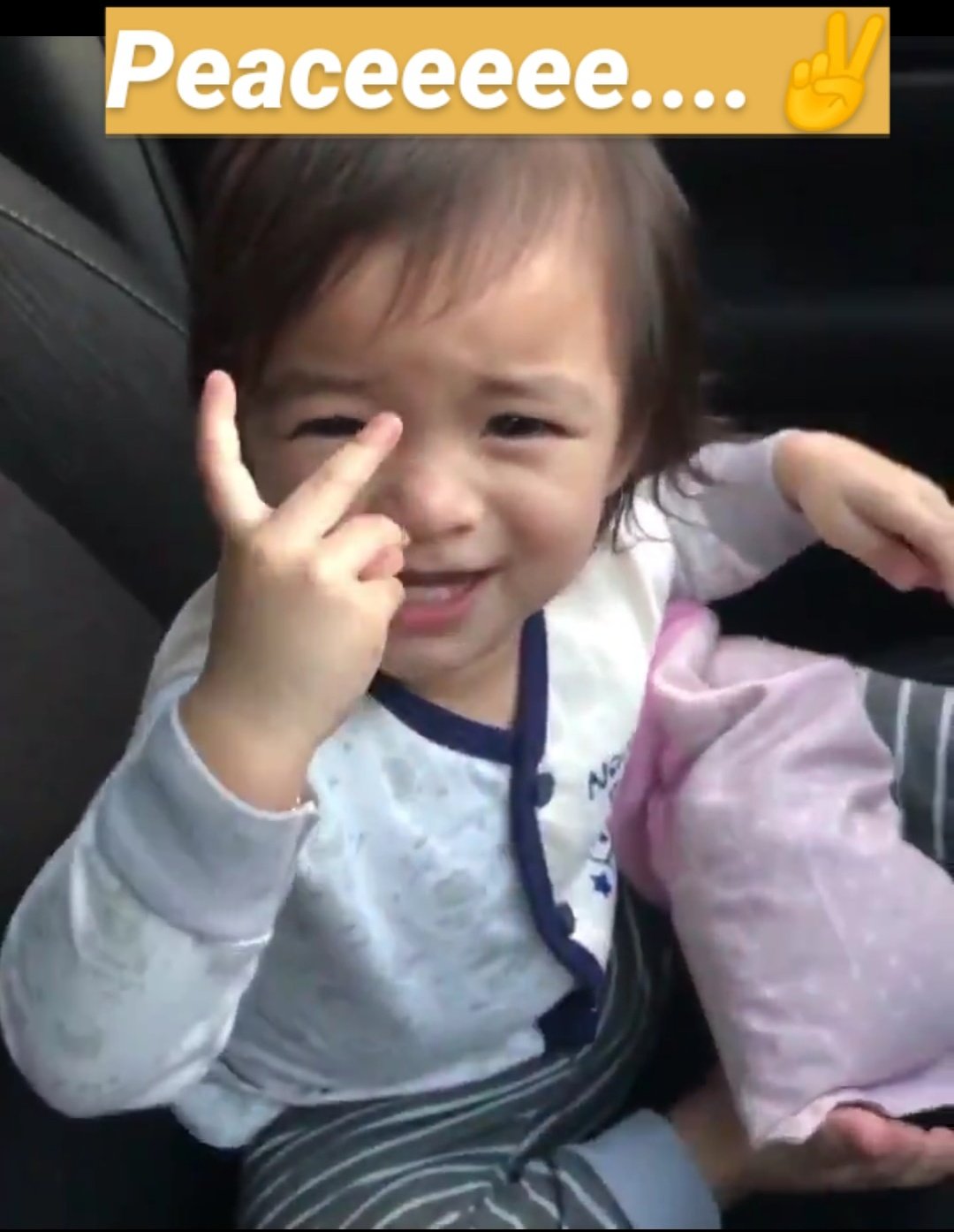 ▼ 这时候女儿“放大招”啦!将“臭臭”抢回来以后,就对着爸爸比了一个剪刀手,然后说:「Peace~~~」
