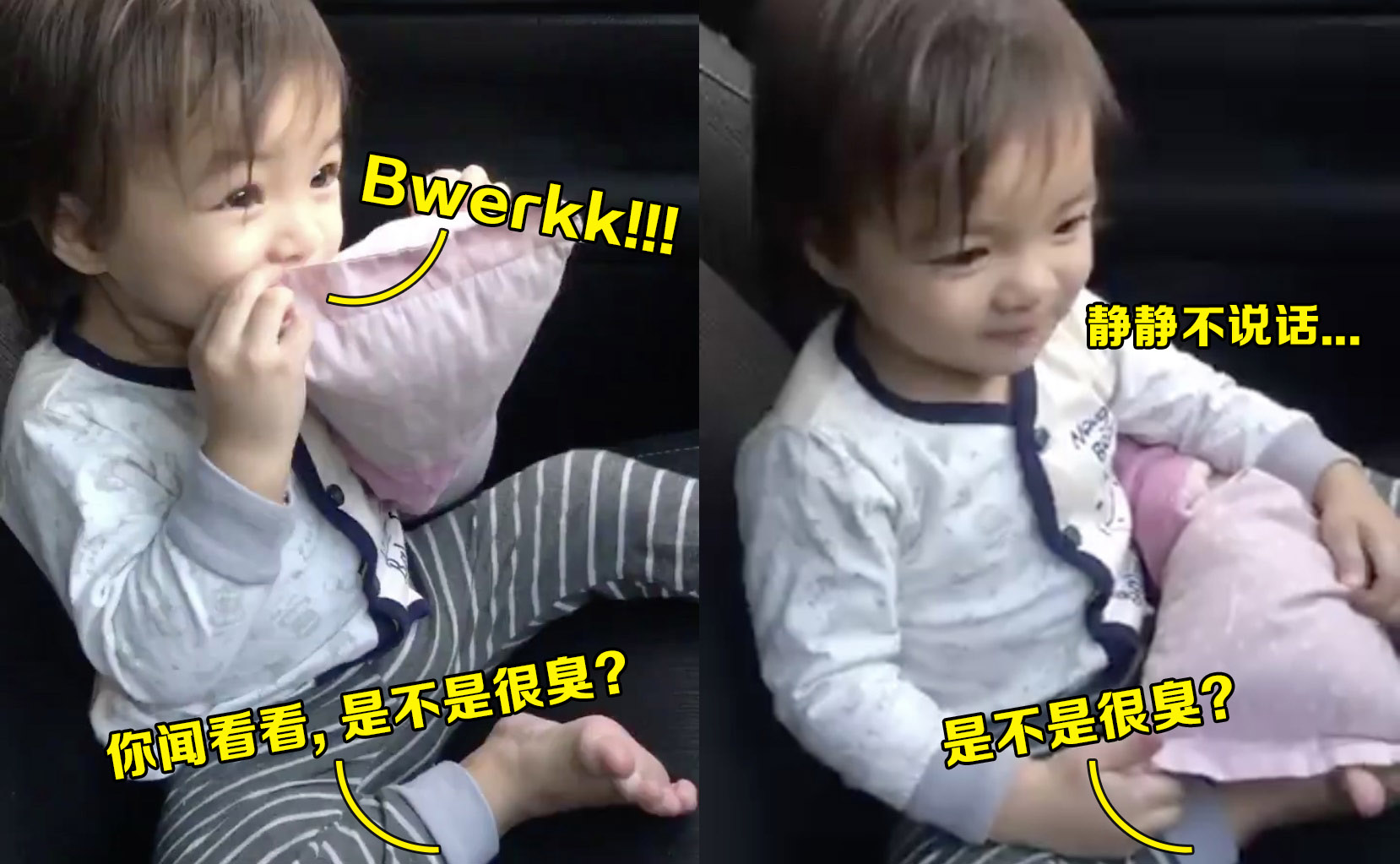 ▼ 爸爸说她的“臭臭”很臭,女娃听了以后就拿起“臭臭”吸一大口气地闻,然后「Bwerkk」了一声!确实很臭…