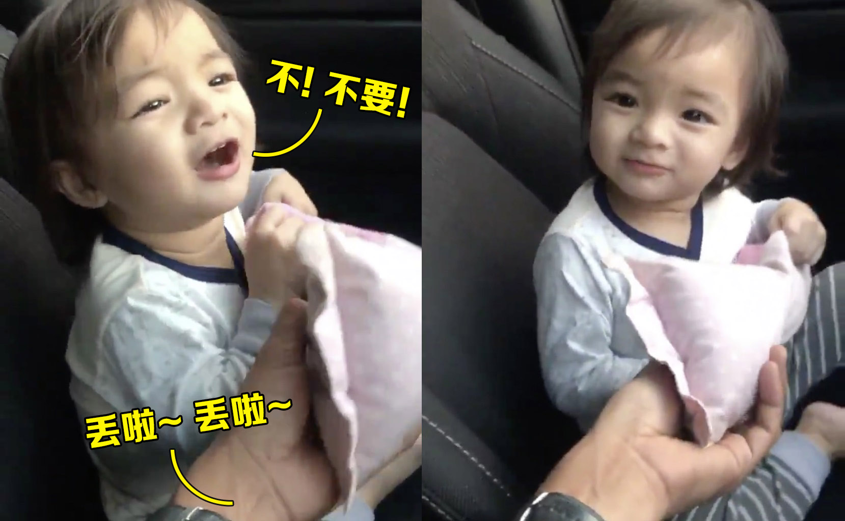 ▼ 爸爸看女儿的反应很可爱,忍不住再逗一逗她,于是就伸手过去试图再次抢走“臭臭”:「丢掉啦~ 丢掉啦~ 」