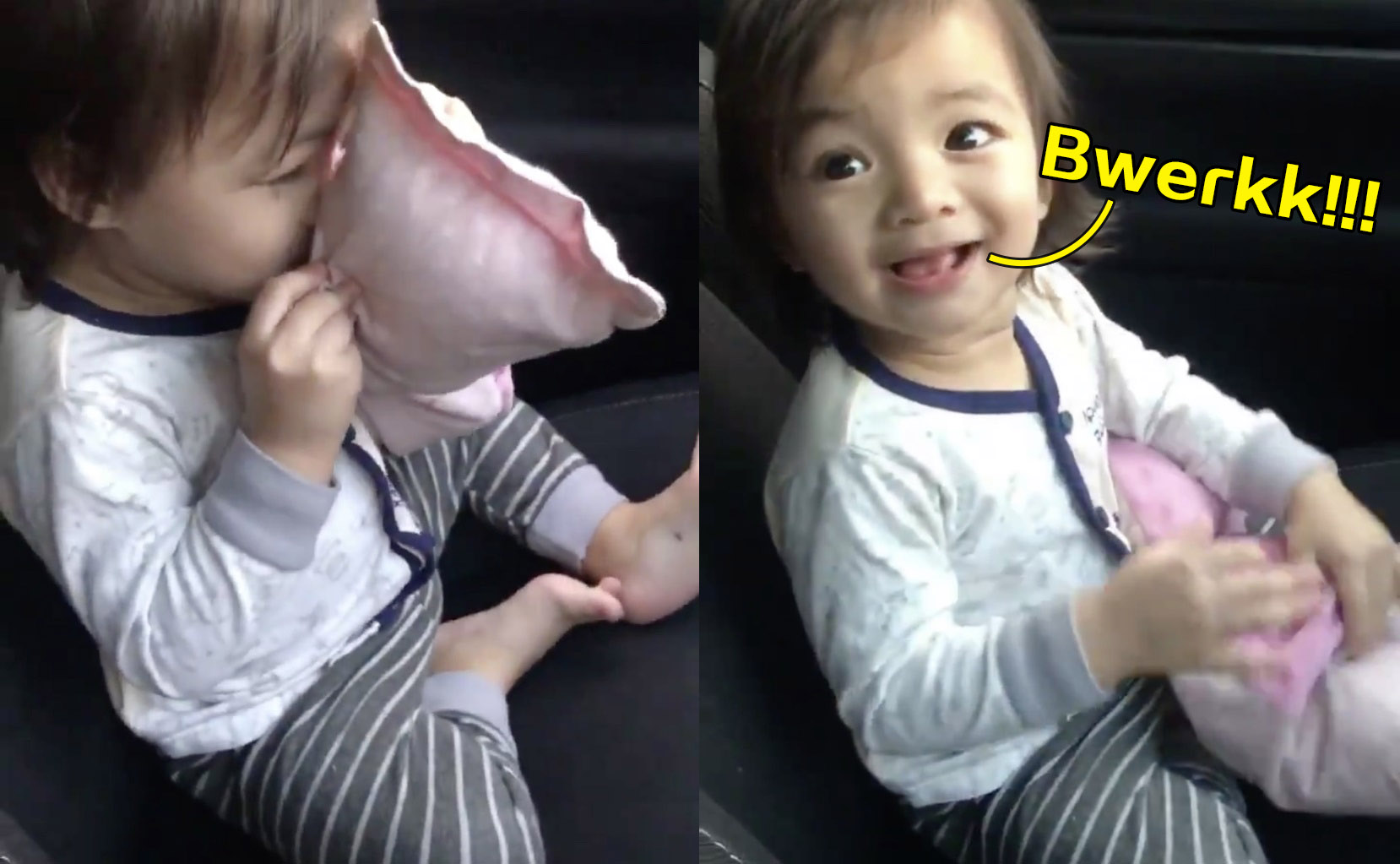▼ 接着,爸爸又和女儿说:「你自己闻看看,是不是很臭?」女儿听话地拿起“臭臭”一闻,又是同样的反应:「Bwerkk!」