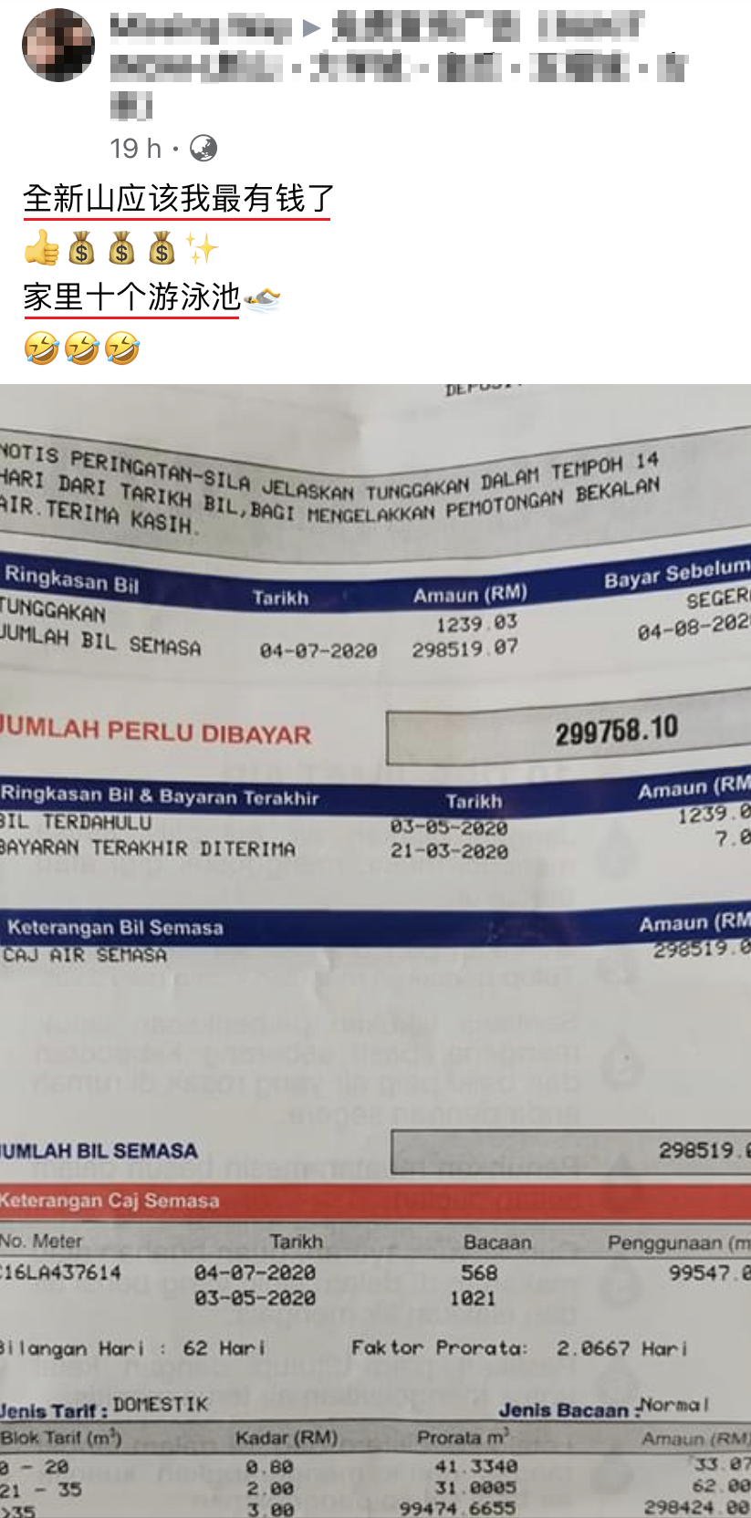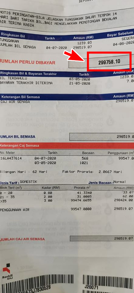 原PO分享的照片是一张7月份收到的水费单据,上面写着她需缴付的费用是 RM299758.10!你没有看到,是将近30万的水费!