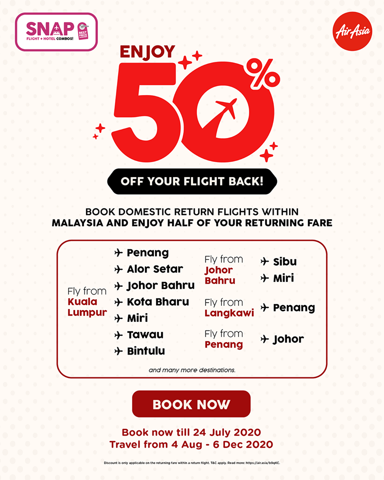 这项优惠从即日起至7月24日推出回程机票【50% Off Your Flight Back】大促销!不管是从浮罗交怡、吉隆玻或槟城等等的国内回程机票,都享有50%折扣优惠!