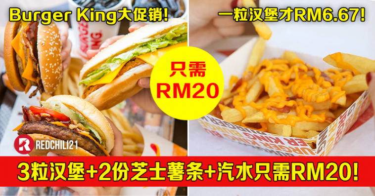 Burger King大促销!3粒汉堡+2份芝士薯条+汽水只需RM20!相等于一粒汉堡才RM6.67!