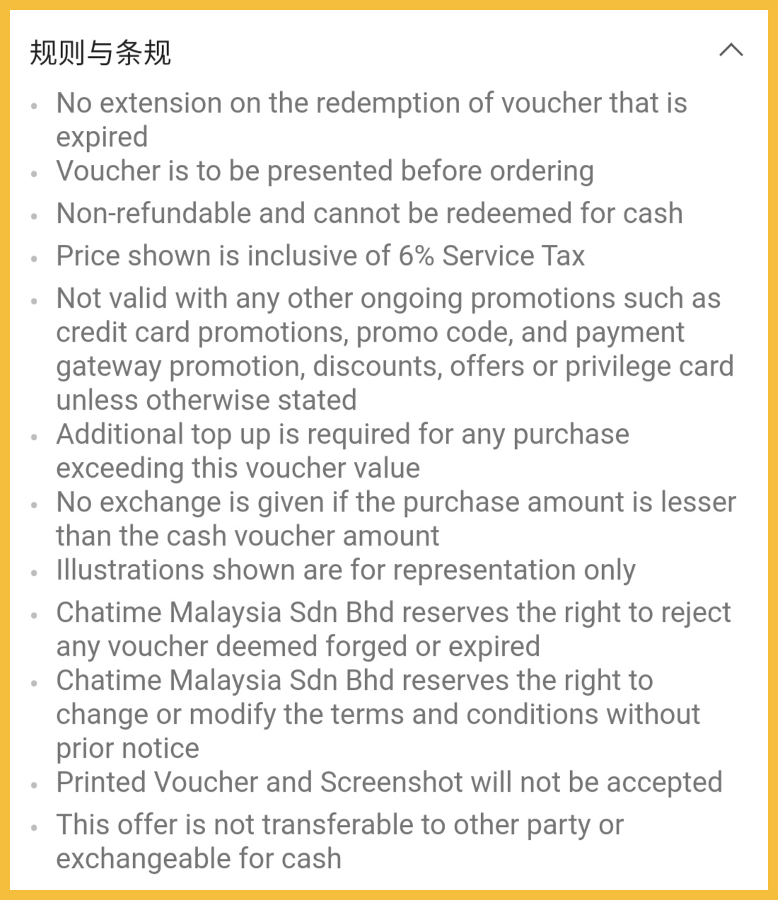 - 此优惠不适参与其他的促销、信用卡促销、优惠代码及任何折扣优惠