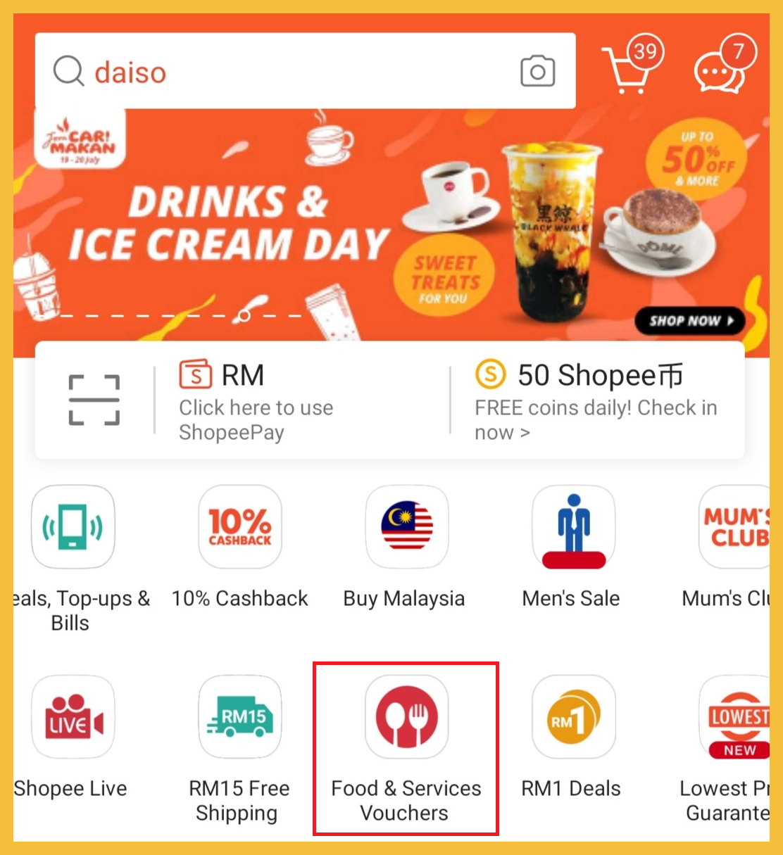 步骤1:打开 Shopee App 点击「Food & Service Voucher 」。