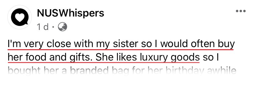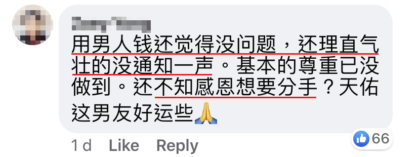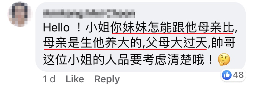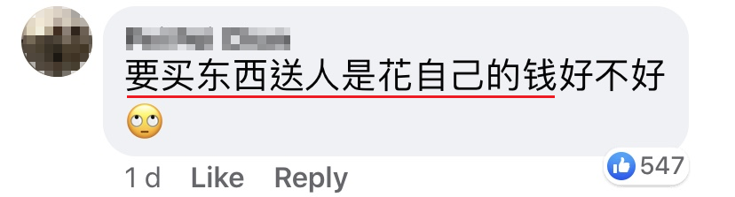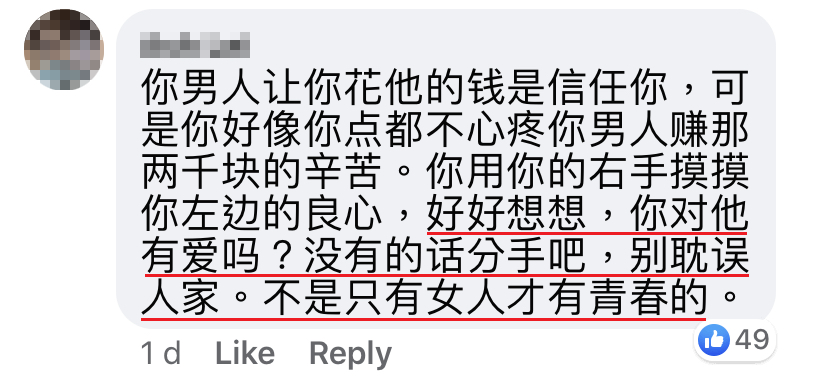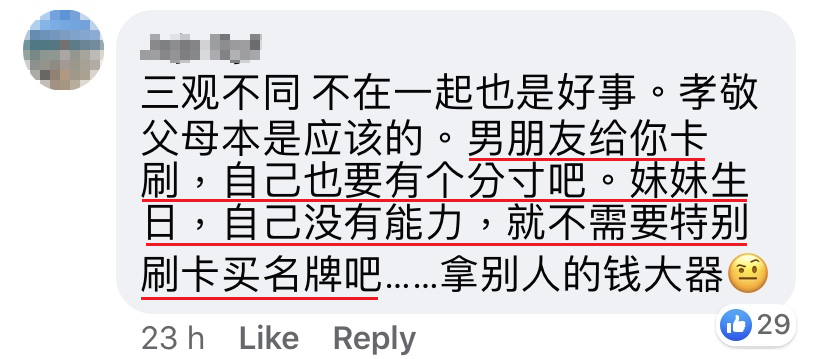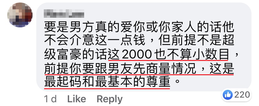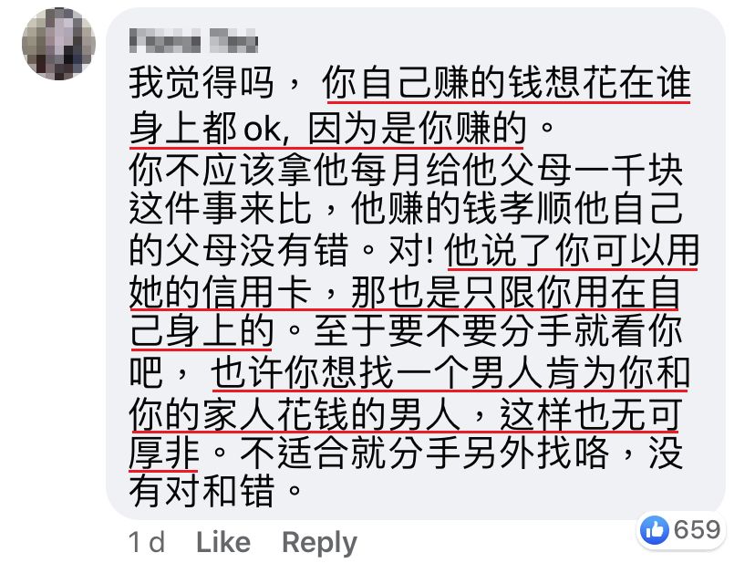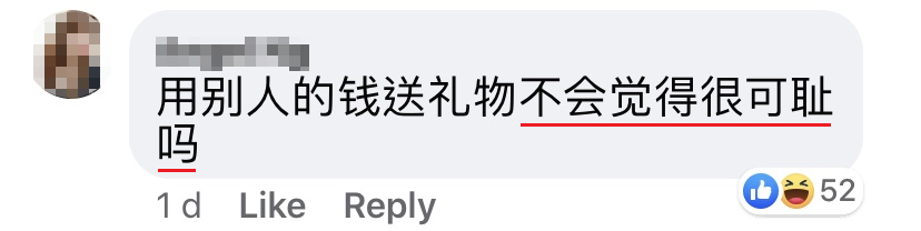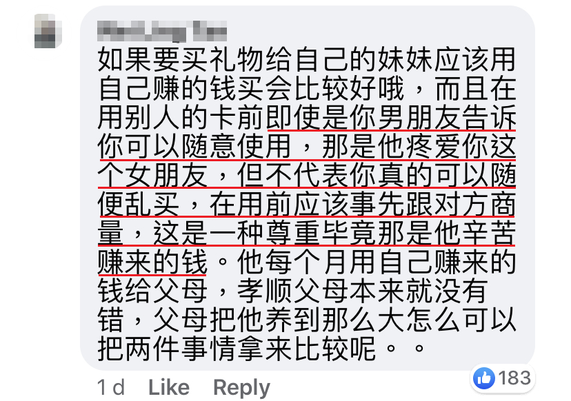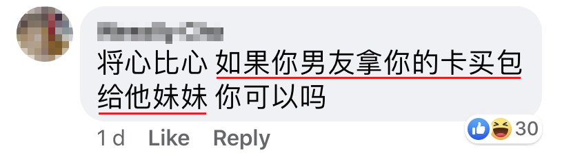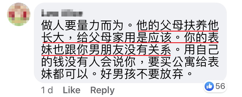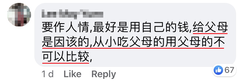 我认为,既然他每个月都可以给父母1000元(约 RM3040),那我为什么不能花2000元(约 RM6090)送礼物给妹妹呢?而他争执的点是他认为他的父母养育他长大,他理所当然用这样的方式报答他们。