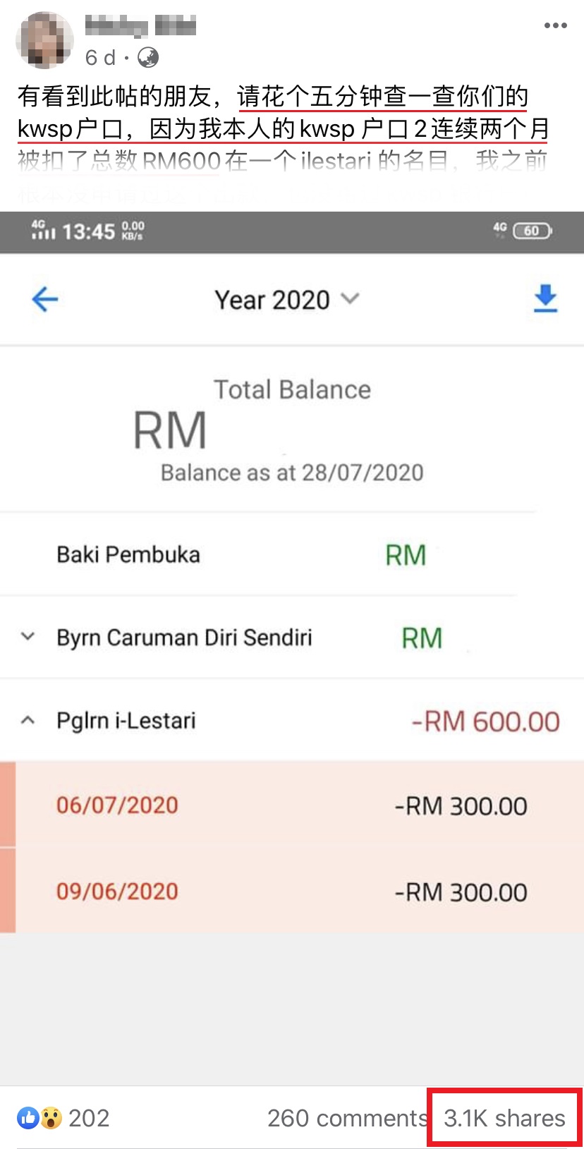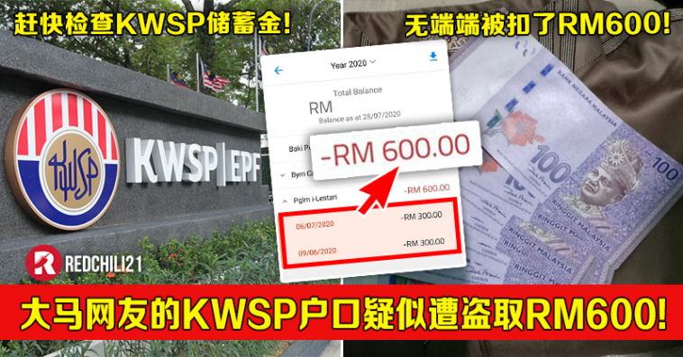 近日一则帖文在面子书疯传,大马网友偶然发现自己的 KWSP 户口无端端被扣了 RM600 ,疑似被有心人士盗取!