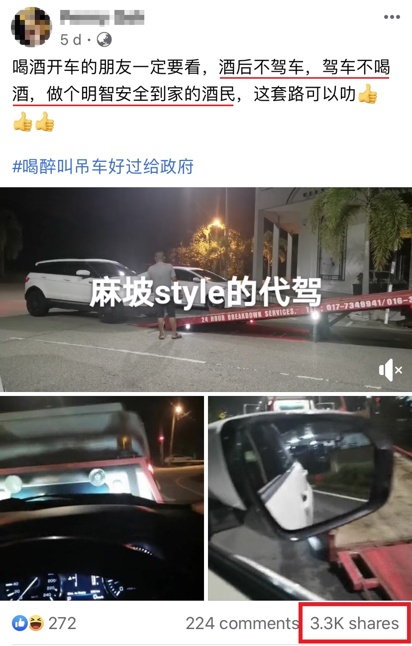 车主在视频里说道:「兄弟我现在喝醉了,麻坡没有代驾,所以我们就叫“吊车”来载我们回家。他载我们回家、放我们下车,才 RM50 !比叫代驾还划算!」
