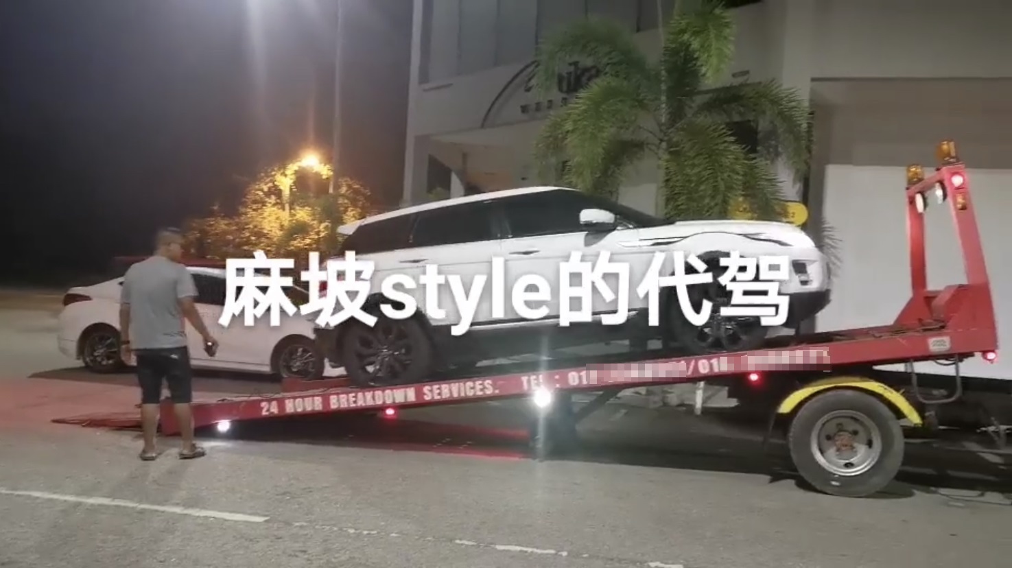 ▼ 第一个视频里写着「麻坡style的代驾」。拖车司机来到该车主的所在位置,然后白色 Range Rover 就顺利地上了拖车。