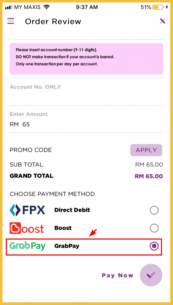 Step 5: 填写你的户口号码和付款的数额,然后选择GrabPay 来付款