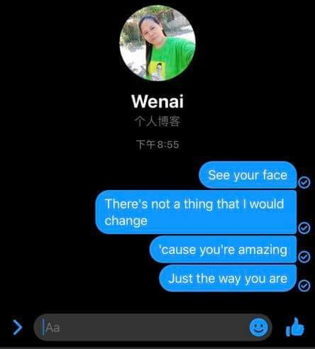 (Wen ai) When I see your face~ There’s not a thing that I would change~ Cause you’re amazing~ Just the way you are~~