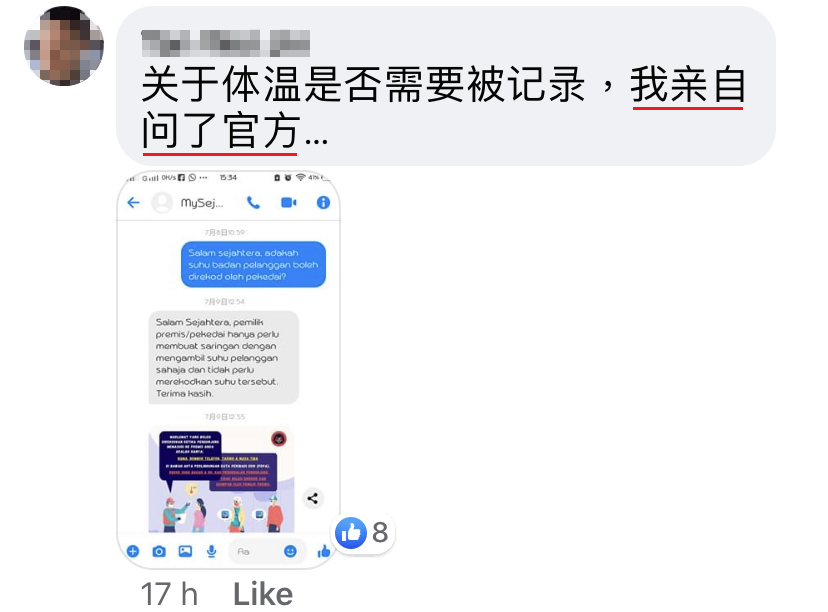 ▼ 网友还问了卫生部的官方面子书,答案是:需测体温但无需记录哦!
