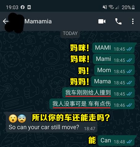 ▼ 从 Zhe Kai 分享的截图可以看到,他在发生车祸以后就立刻联系自己的母亲,告知她车祸的事。Zhe Kai 为了不让妈妈担心,还和妈妈报平安说:「我人没事,可是车有点伤。」