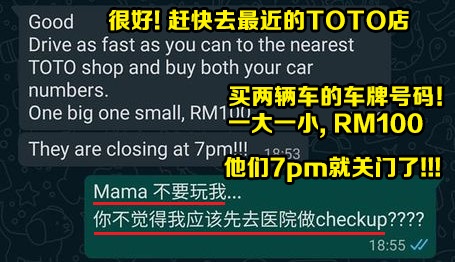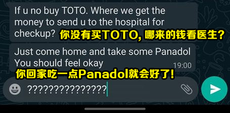 ▼ 妈妈冷静地回答:「如果你没有买 TOTO,我们哪里有钱带你去医院做身体检查呢?你等下回来家里,然后吃一点 Panadol 就会没事了!」