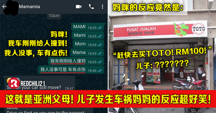 ▼ 结果妈妈的反应出乎 Zhe Kai 预料!妈妈首先问的是车子是否还能走动,接着就叫儿子用最快的速度开车去临近的 TOTO(彩票)店买字,而且是 RM100 一大一小! 儿子傻眼地回复:「妈妈,不要玩我… 你不觉得我应该先去医院做身体检查吗?」