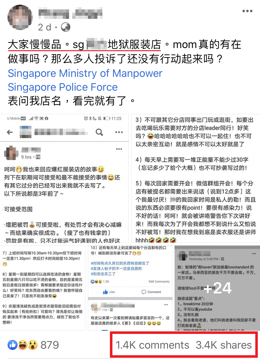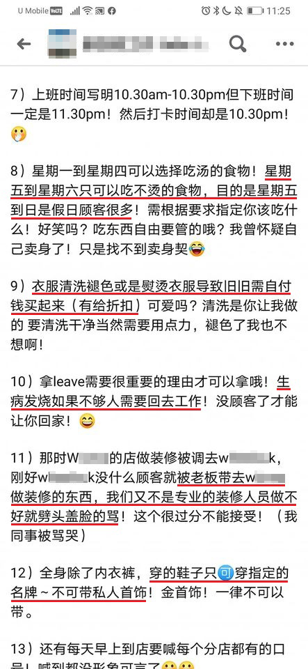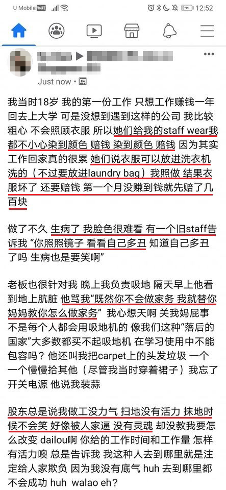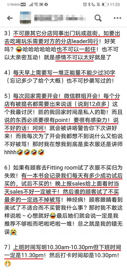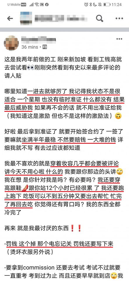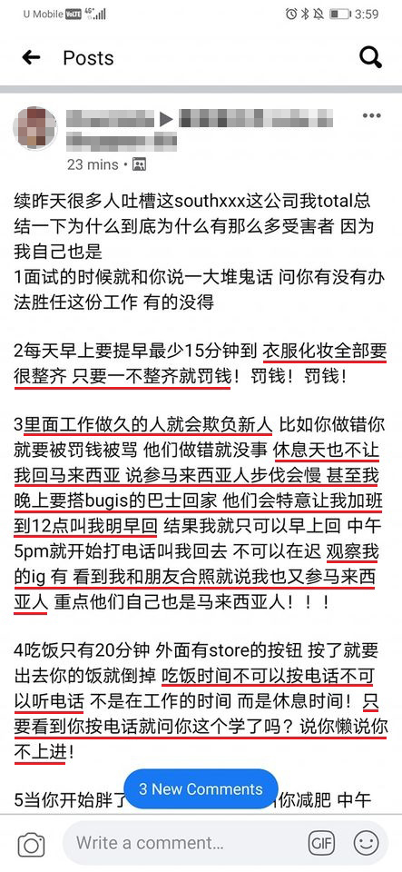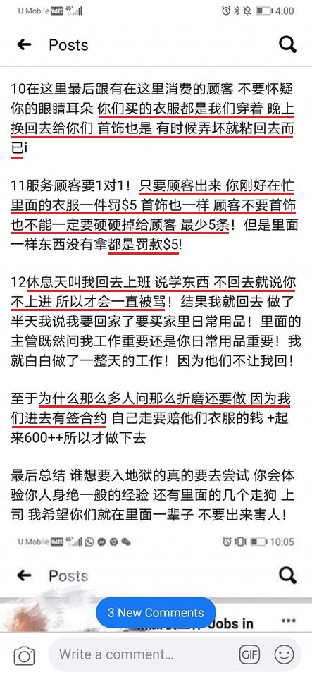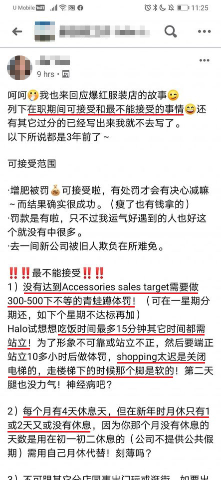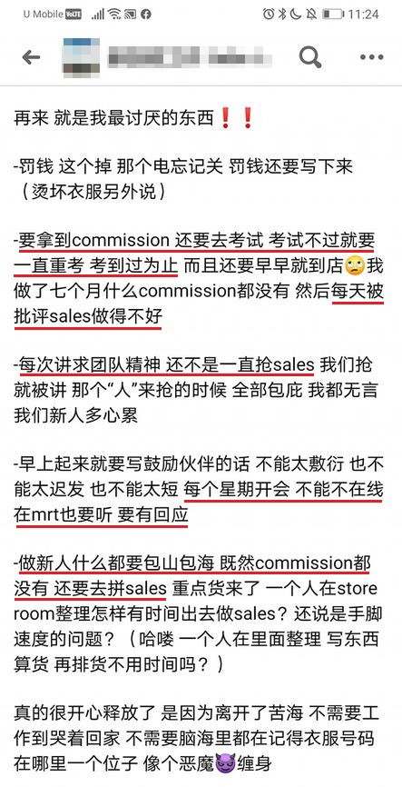 近日面子书流传一连串爆料帖文,贴主们全是来自同一家新加坡服饰店的前员工,指员工的业绩不达标就要被处罚“青蛙蹲”,休息时间只有20分钟且规定不可使用手机,就连变胖也要被罚!