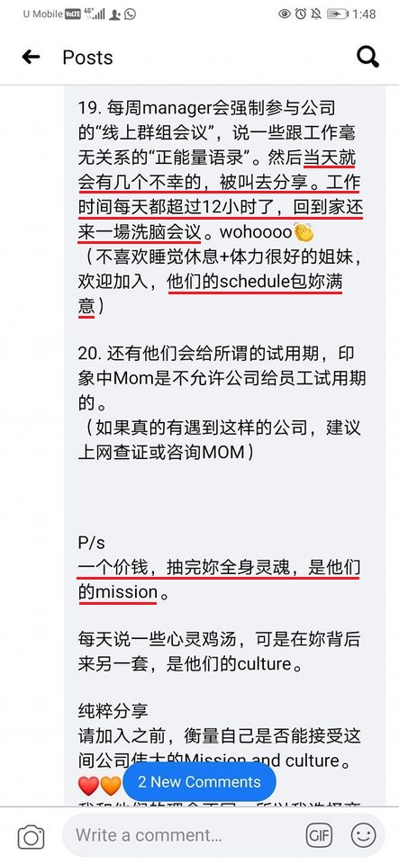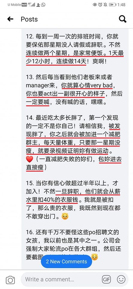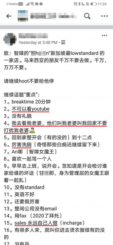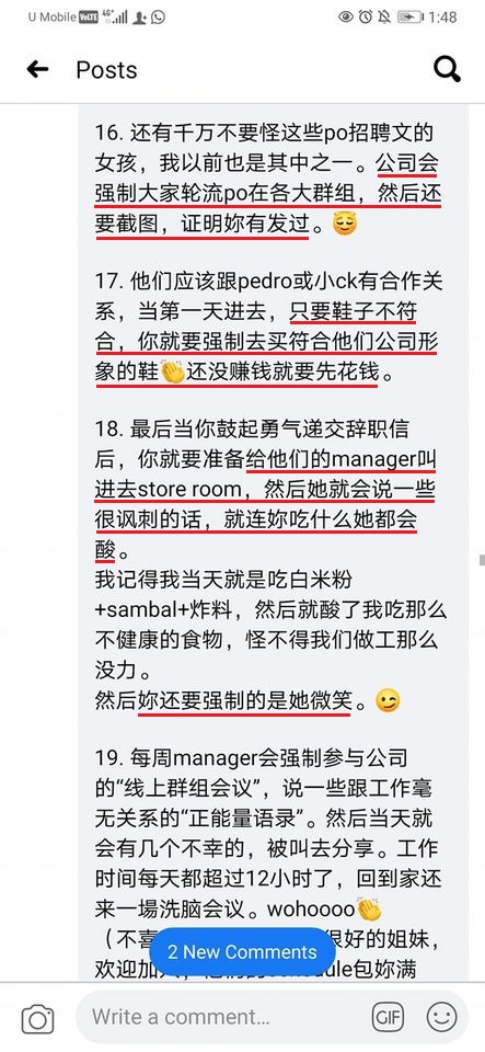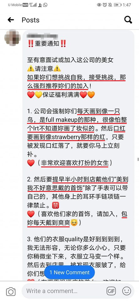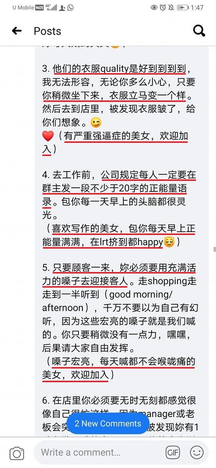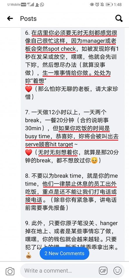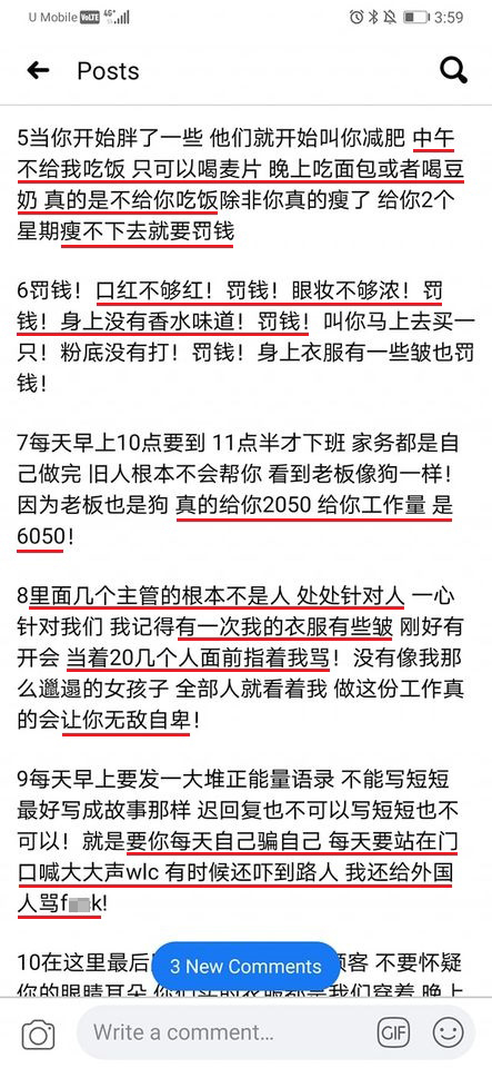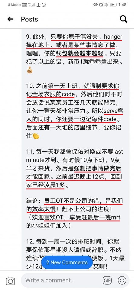 近日面子书流传一连串爆料帖文,贴主们全是来自同一家新加坡服饰店的前员工,指员工的业绩不达标就要被处罚“青蛙蹲”,休息时间只有20分钟且规定不可使用手机,就连变胖也要被罚!