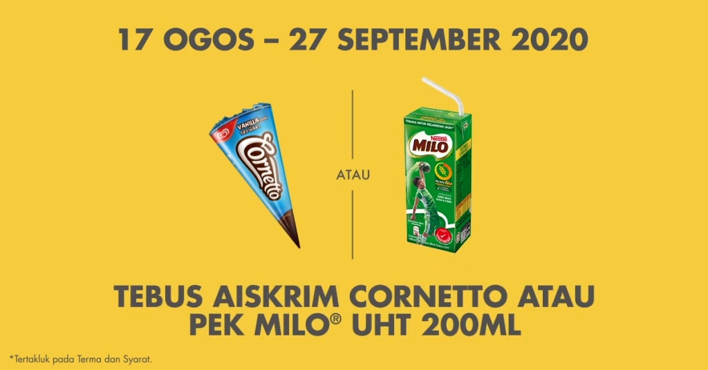 没错~ 从即日起至9月27日,在Shell 油站添油RM40 或以上,可免费获得一支Cornetto 冰淇淋或一盒 Milo 饮料!