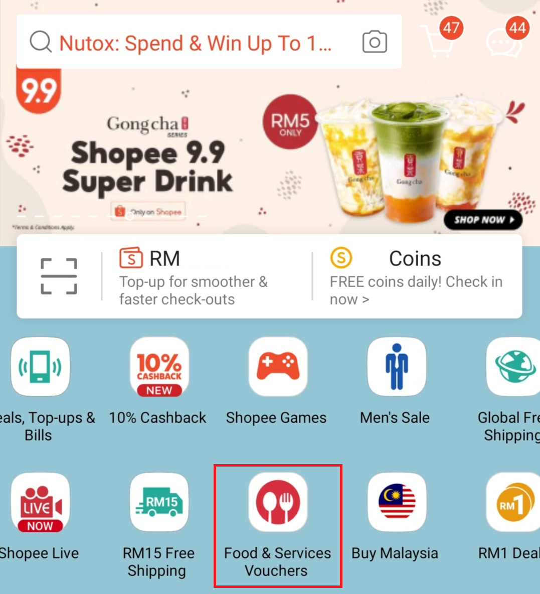 步骤1: 首先打开 Shopee App,点击「Food & Service Voucher 」!