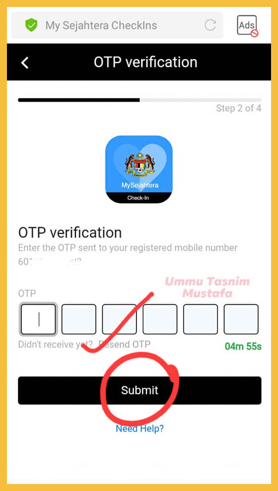 ▼ Step 3:通过讯息接收 OTP 验证码,输入后点击 “Submit” 。