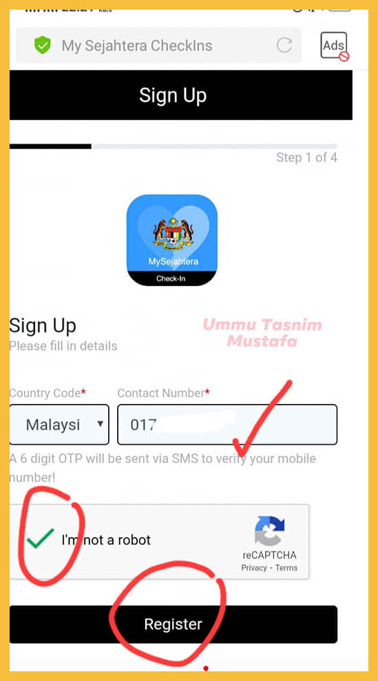▼ Step 2:输入手机号码,在“I’m not a robot”验证处打勾,接着点击“Register”。