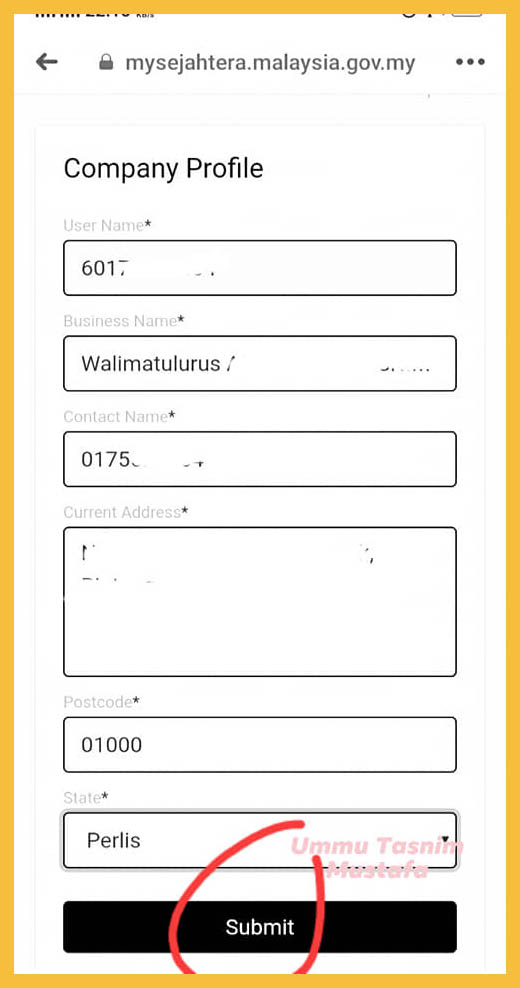 ▼ Step 4:填写资料(用户名、活动名/店名、联络号码、活动地址/店的地址、Postcode以及州属。),完成后点击 “Submit”。