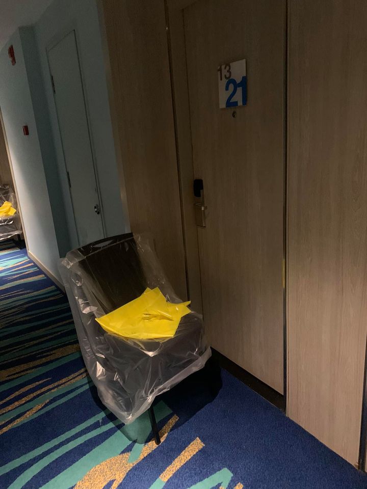 每天的食物,都会是由酒店安排,放在我房间门口的椅子上。如果他们没准时送到,我也做不到什么,因为我基本上是被限制在房间。