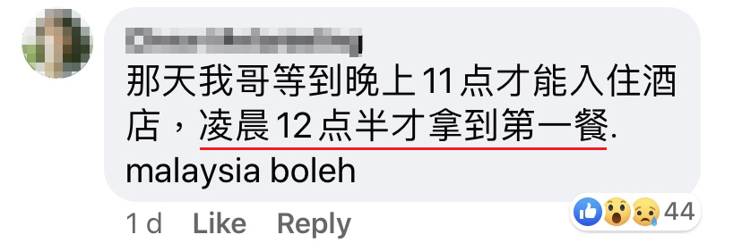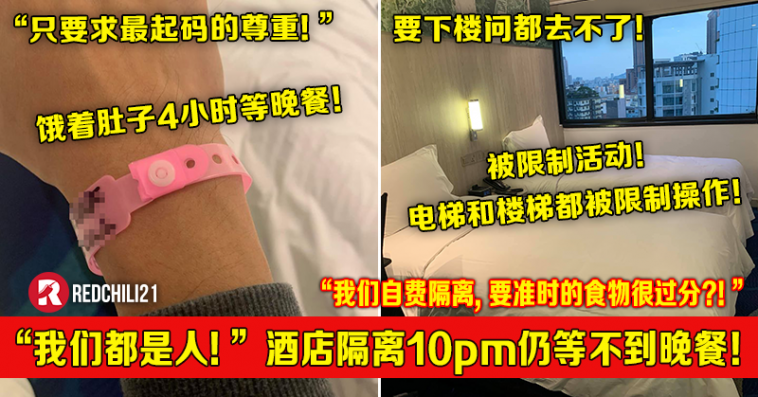近日一名刚从国外返马的大马男子通过面子书分享经历,入住隔离酒店后迟迟等不到晚餐,直到将近晚上10点,被隔离者们仍在挨饿,苦苦等着酒店员工分派餐点。