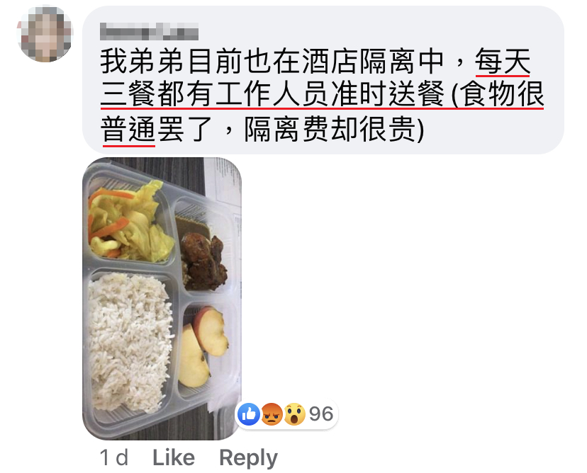 我告诉他,我是来隔离的,我是正在做我的本分,隔离保护大家,我不是犯人,我也有给隔离费的,最起码的态度。别当我是一位犯人在求他,我只是要求我的食物,这是我最基本的要求 (人权)。也最起码,我在做好我的隔离本分,他也应该做好身为酒店员工该做的本分。