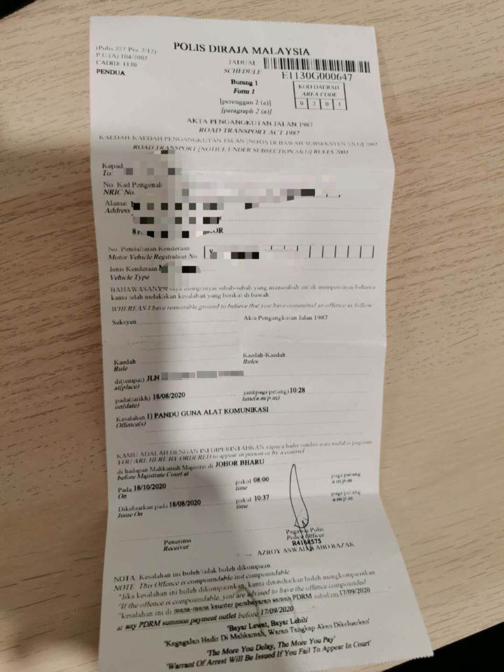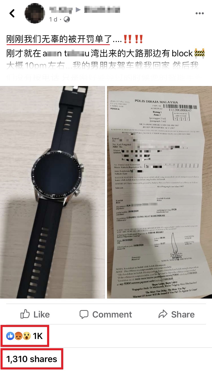 近日一名大马女网友在面子书群组分享经历,负责开车的男友和坐在副驾座的她明明都没有滑手机,却被无辜地开了一张 RM1000 的罚单!