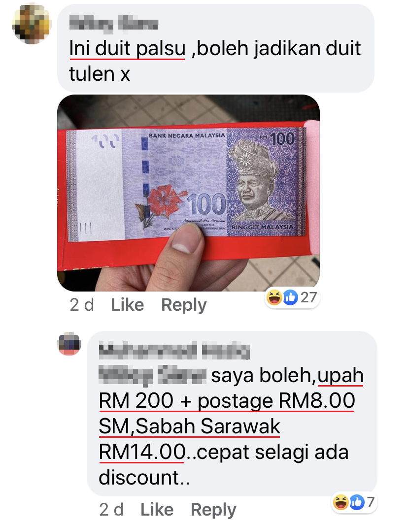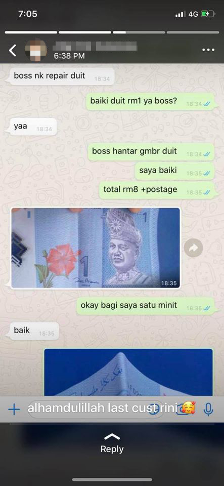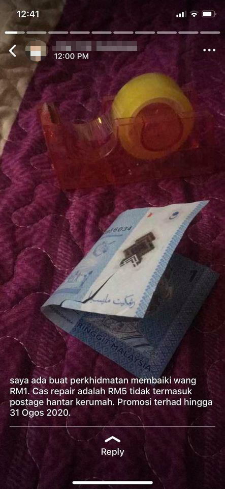 并且在帖文里写道:「我目前有提供一项“修补 RM1 钞票”的服务,修补的费用是 RM5,不包括寄到家里的邮费。此价格是限时的优惠价,优惠的截止日期为 2020年8月31日。」