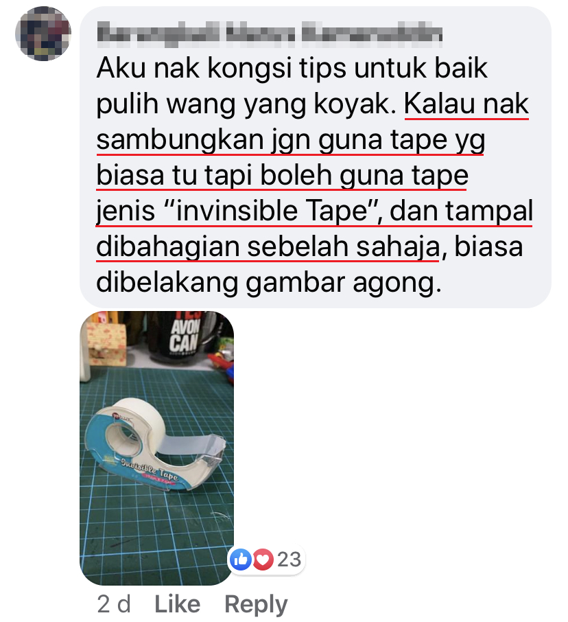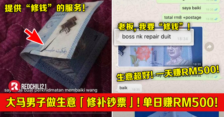 近日一组照片在社交媒体流传,一名大马男子在网上做起一门独特的生意,那就是帮顾客“修钱”,将破损的钞票修复。这看似荒唐的生意相信许多人都不看好,然而他却在一天内净赚 RM500 多!