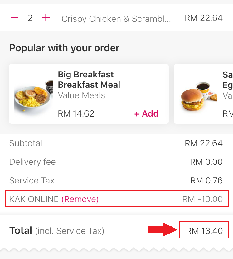 ※2x Crispy Chicken & Scrambled Egg 汉堡早餐折扣RM10 后只需RM13.40,那么1份算起来就只需RM6.70 而已哦!