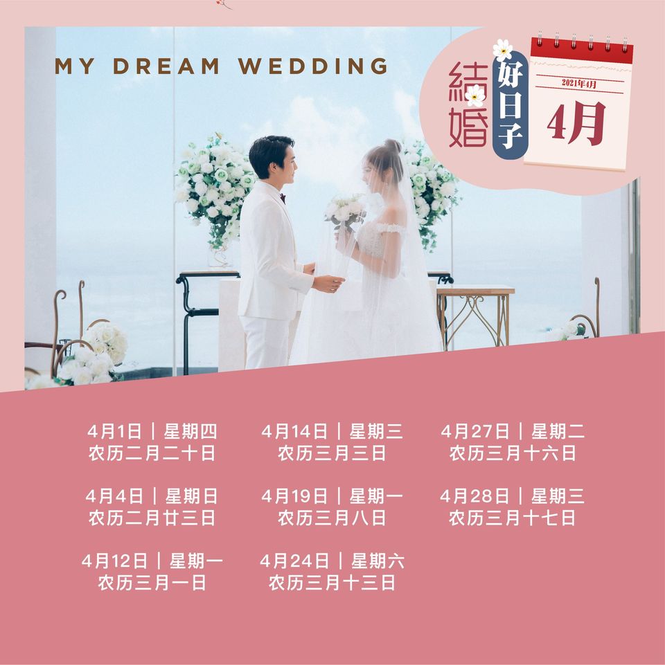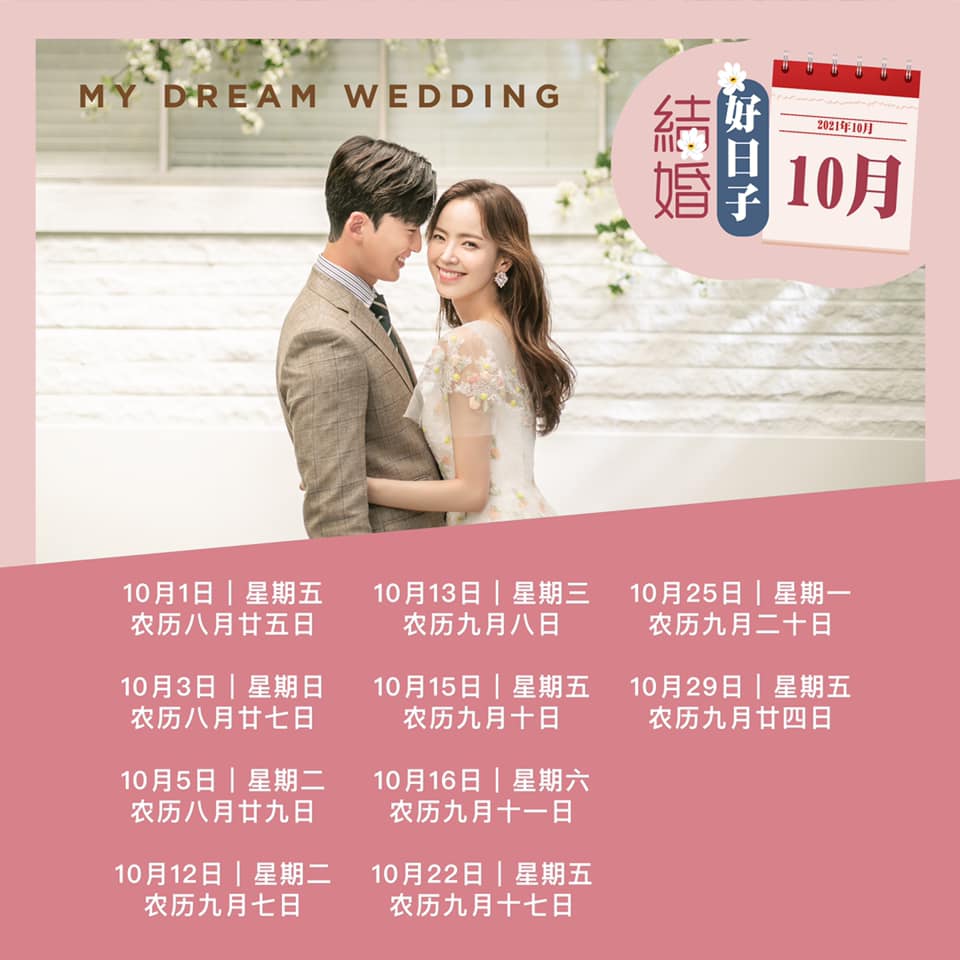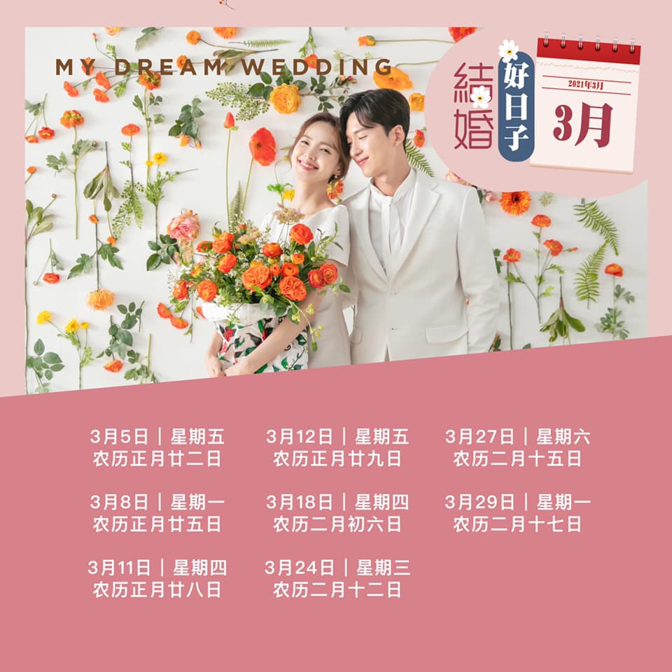 根据My Dream Wedding 在面子上分享「2021年全年结婚吉日」,且共有120天是适合结婚的好日子!想在2021年准备结婚的情侣们,可提前挑选吉日啦!