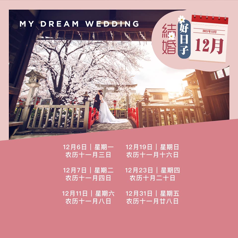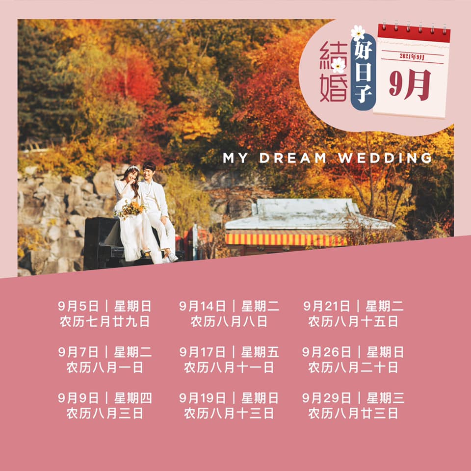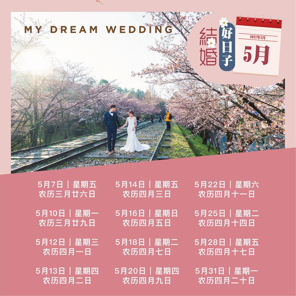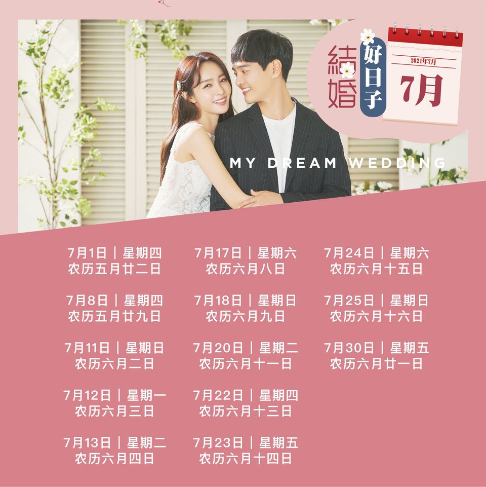 根据My Dream Wedding 在面子上分享「2021年全年结婚吉日」,且共有120天是适合结婚的好日子!想在2021年准备结婚的情侣们,可提前挑选吉日啦!