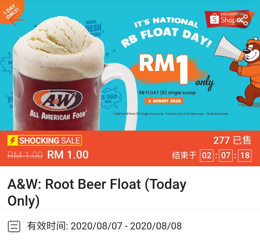 促销活动:Shopee 与 A&W 联合推出 RB Float With single scoop 只需RM1 优惠券