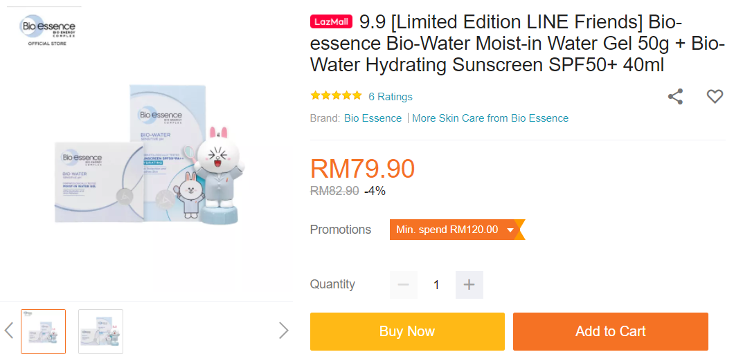 ▼② Bio-essence Bio-Water Moist-in Water Gel 50g + Bio-Water Hydrating Sunscreen SPF50+ 40ml,免费送出限量版Cony 锁匙圈款泉水盖 —— 售价为RM79.90