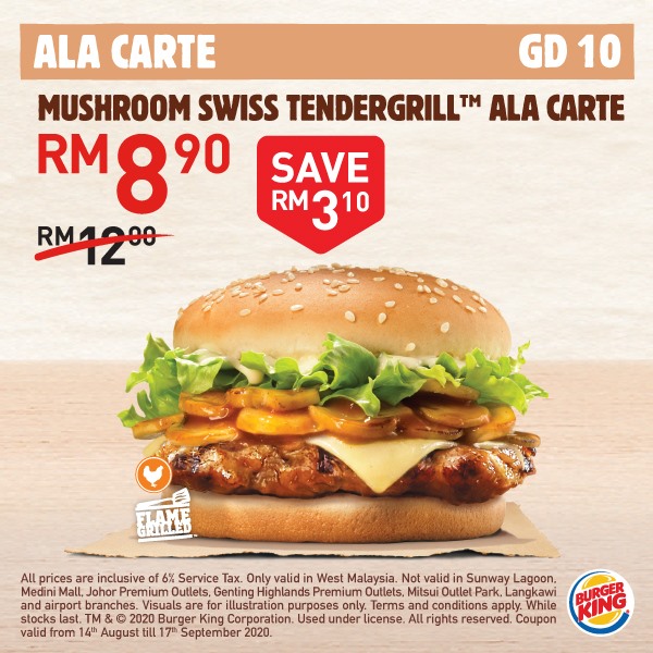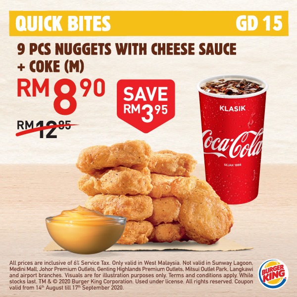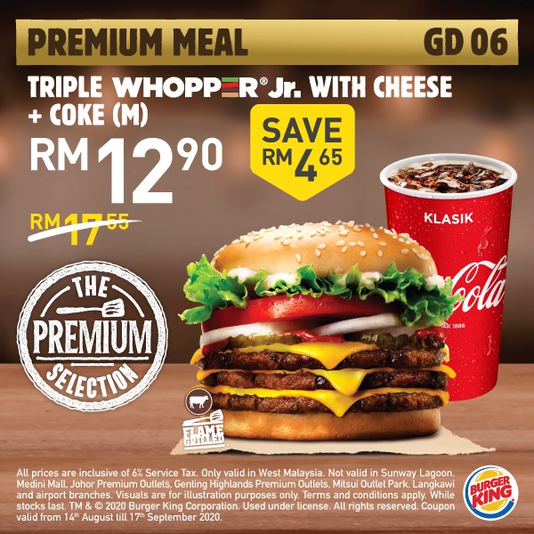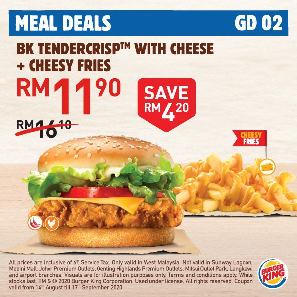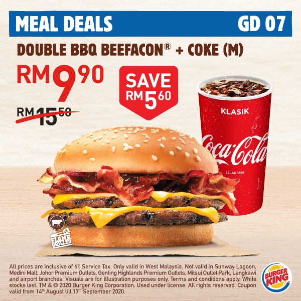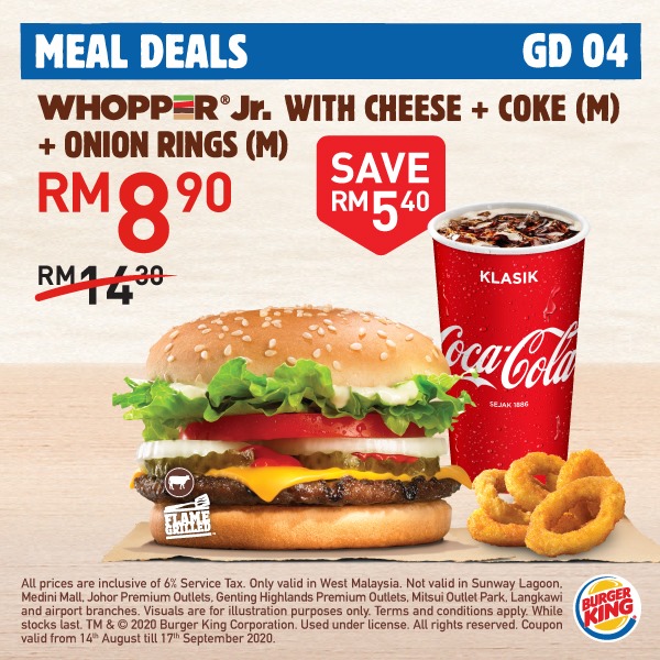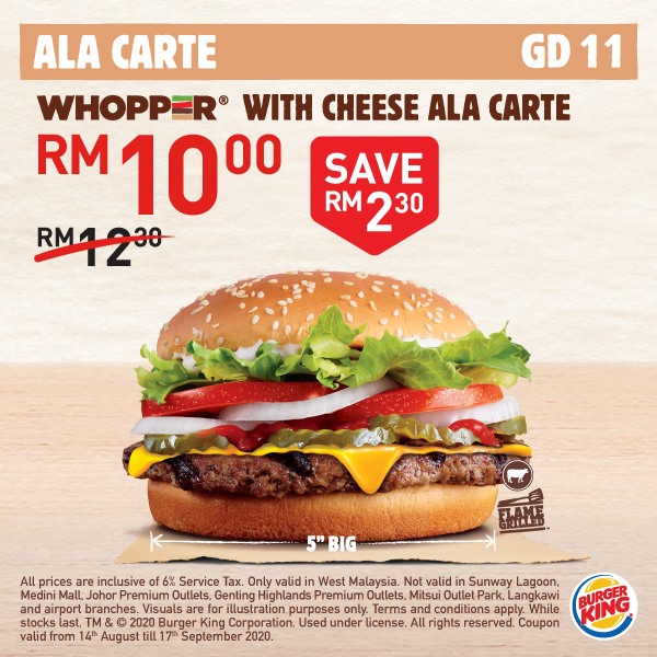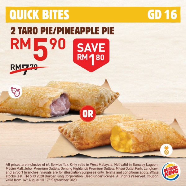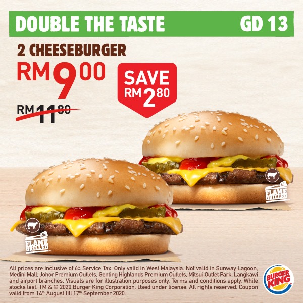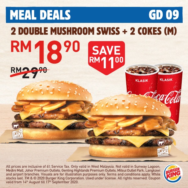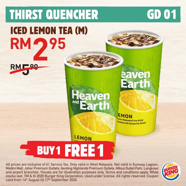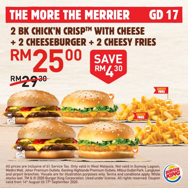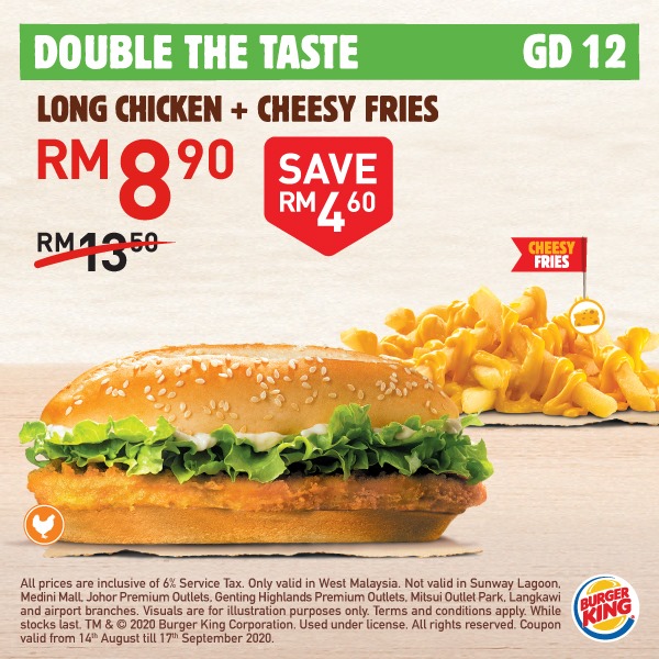 促销地点:西马Burger King分行(除了Medini Mall、Sunway Lagoon、Genting Highlands Premium Outlet、Johor Premium Outlet、Mitsui Outlet Park 和Airport分行)