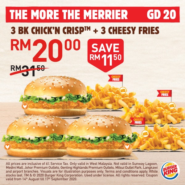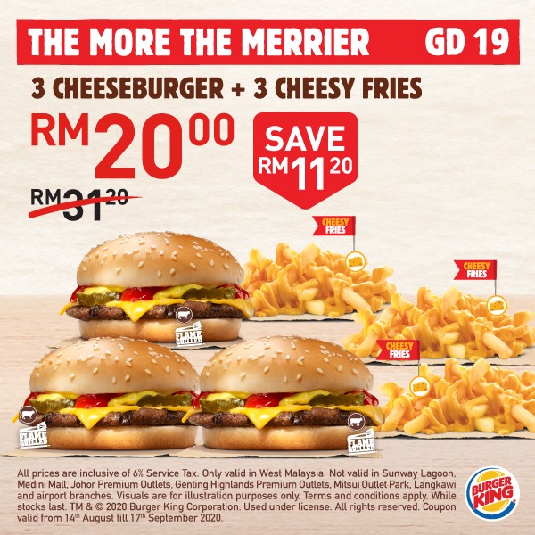 别忘了~Burger King还推出3粒汉堡+2份芝士薯条+汽水只需RM20!