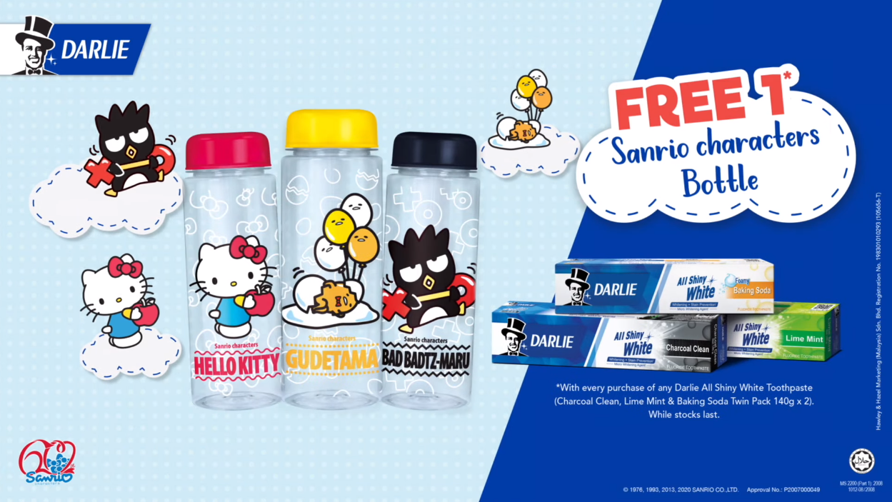 这次和以往一样,只要你购买任何 Darlie All Shiny White 双盒装牙膏,将免费送出3款 Sanrio 系列水瓶!