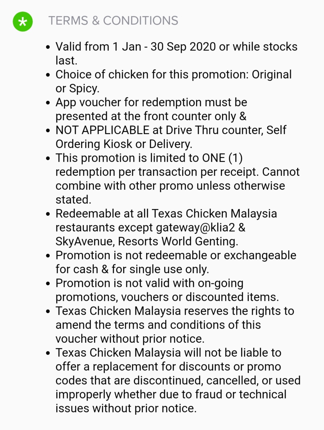 促销地点:大马 Texas Chicken 分行(除了gateway@klia 2,Sky Avenue,Resort World Genting)