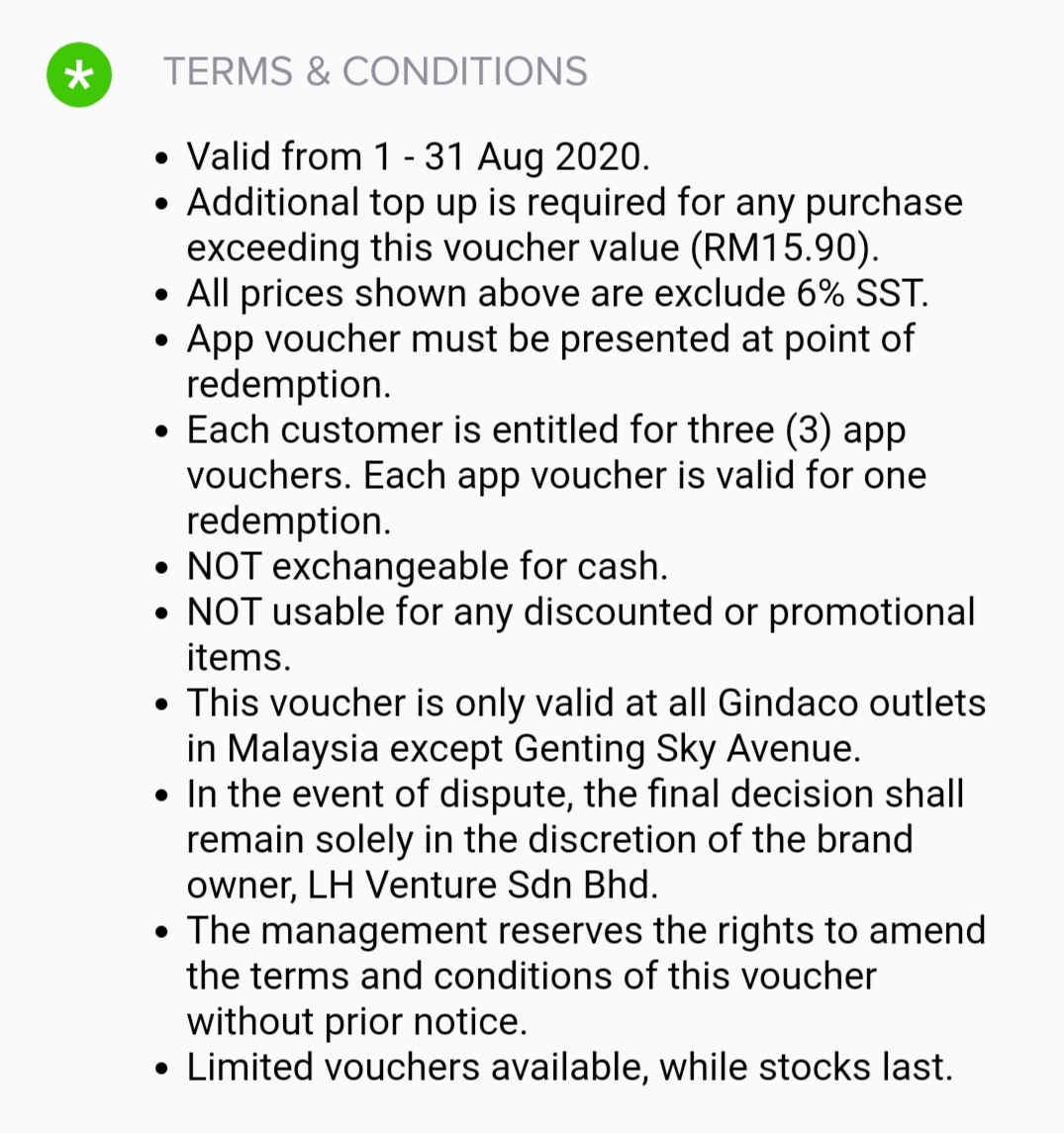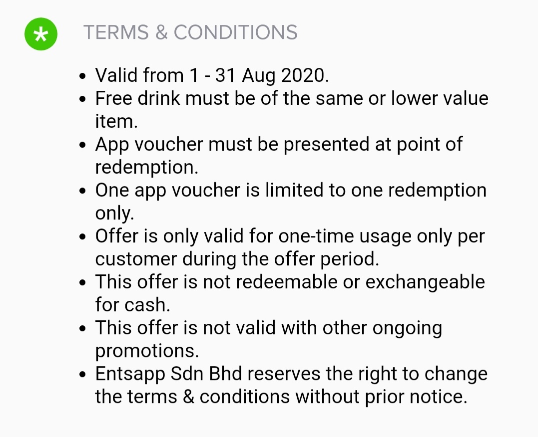 - 免费饮料必须同等于或低过RM6.90的饮料