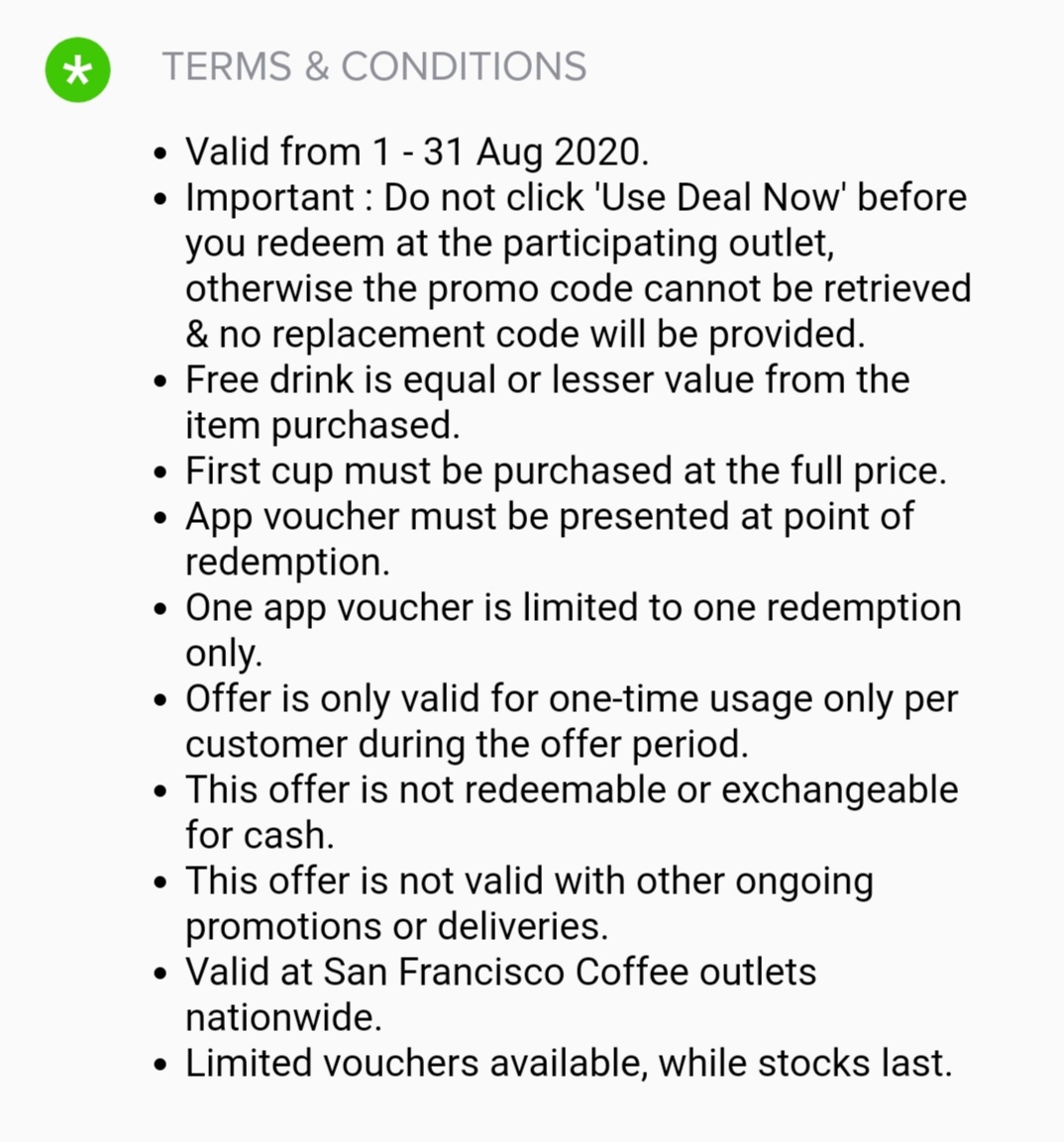 - 免费饮料必须同等于或低过第一杯饮料的价格