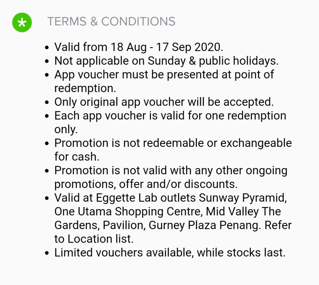 促销地点:大马 Eggette Lab 分行(除了Sunway Pyramid、One Utama Shopping Centre、Mid Valley The Gardens、Pavillion、Gurney Plaza Penang 分行)