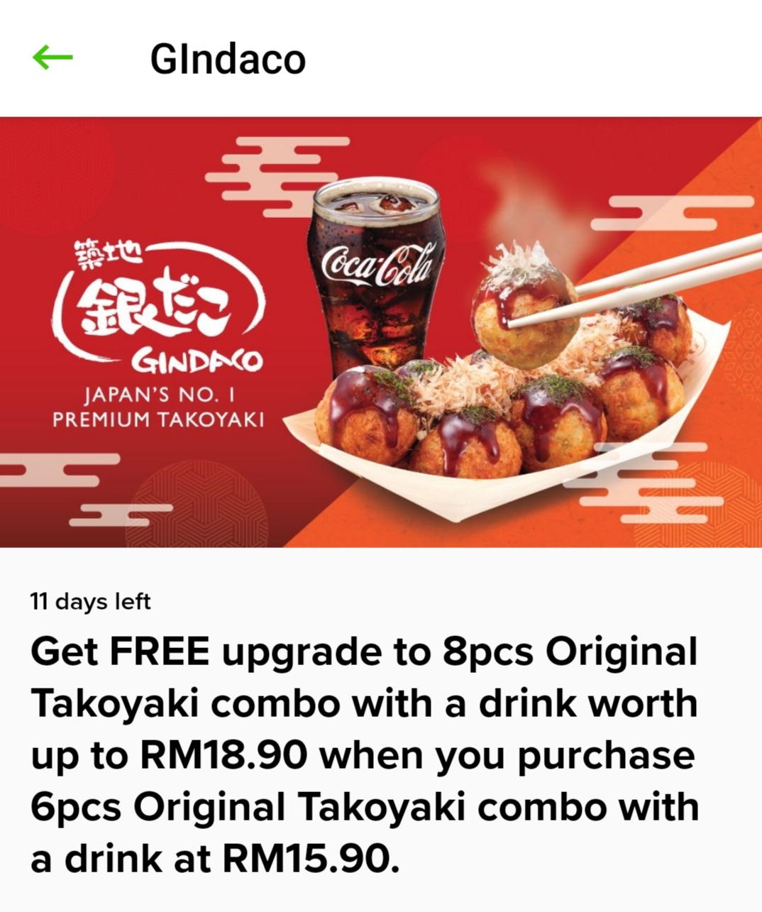 11. Gindaco —— 购买6粒原味章鱼烧套餐,可免费升级(Upgrade)成8粒章鱼烧只需RM15.90