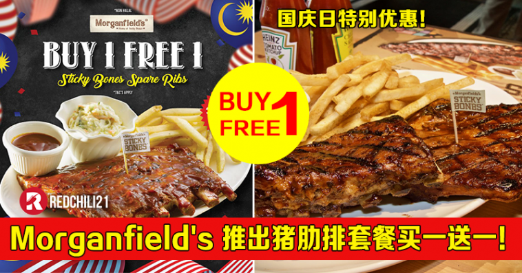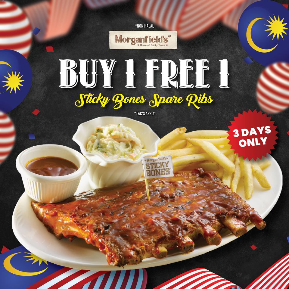 为了迎接即将来临的国庆日,大马Morganfield’s 推出招牌猪肋排套餐(Sticky Bones® Spare Ribs)买一送一大优惠啦!